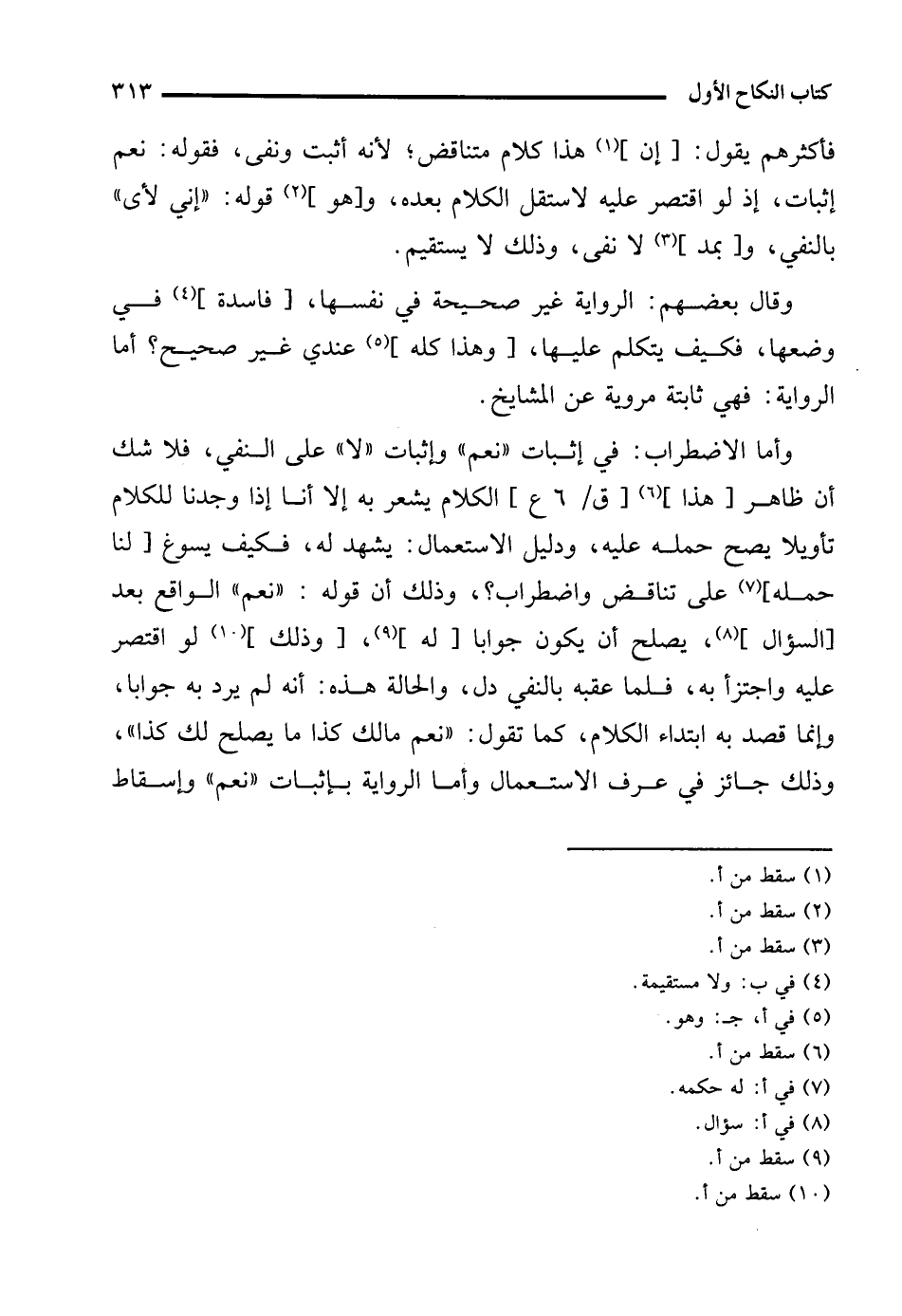 وأما الاضطراب: في إثبات "نعم" وإثبات "لا" على النفي، فلا شك أن ظاهر [هذا] (¬6) الكلام يشعر به إلا أنا إذا وجدنا للكلام تأويلا يصح حمله عليه، ودليل الاستعمال: يشهد له، فكيف يسوغ [لنا حمله] (¬7) على تناقض واضطراب؟، وذلك أن قوله: "نعم" الواقع بعد [السؤال] (¬8)، يصلح أن يكون جوابا [له] (¬9)، [وذلك] (¬10) لو اقتصر عليه واجتزأ به، فلما عقبه بالنفي دل، والحالة هذه: أنه لم يرد به جوابا، وإنما قصد به ابتداء الكلام، كما تقول: "نعم مالك كذا ما يصلح لك كذا"، وذلك جائز في عرف الاستعمال وأما الرواية بإثبات "نعم" وإسقاط