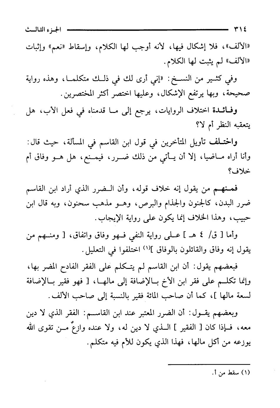 فبعضهم يقول: أن ابن القاسم لم يتكلم على الفقر الفادح المضر بها، وإنما تكلم على فقر ابن الأخ بالإضافة إلى مالها، [فهو فقير بالإضافة لسعة مالها]، كما أن صاحب المائة فقير بالنسبة إلى صاحب الألف.