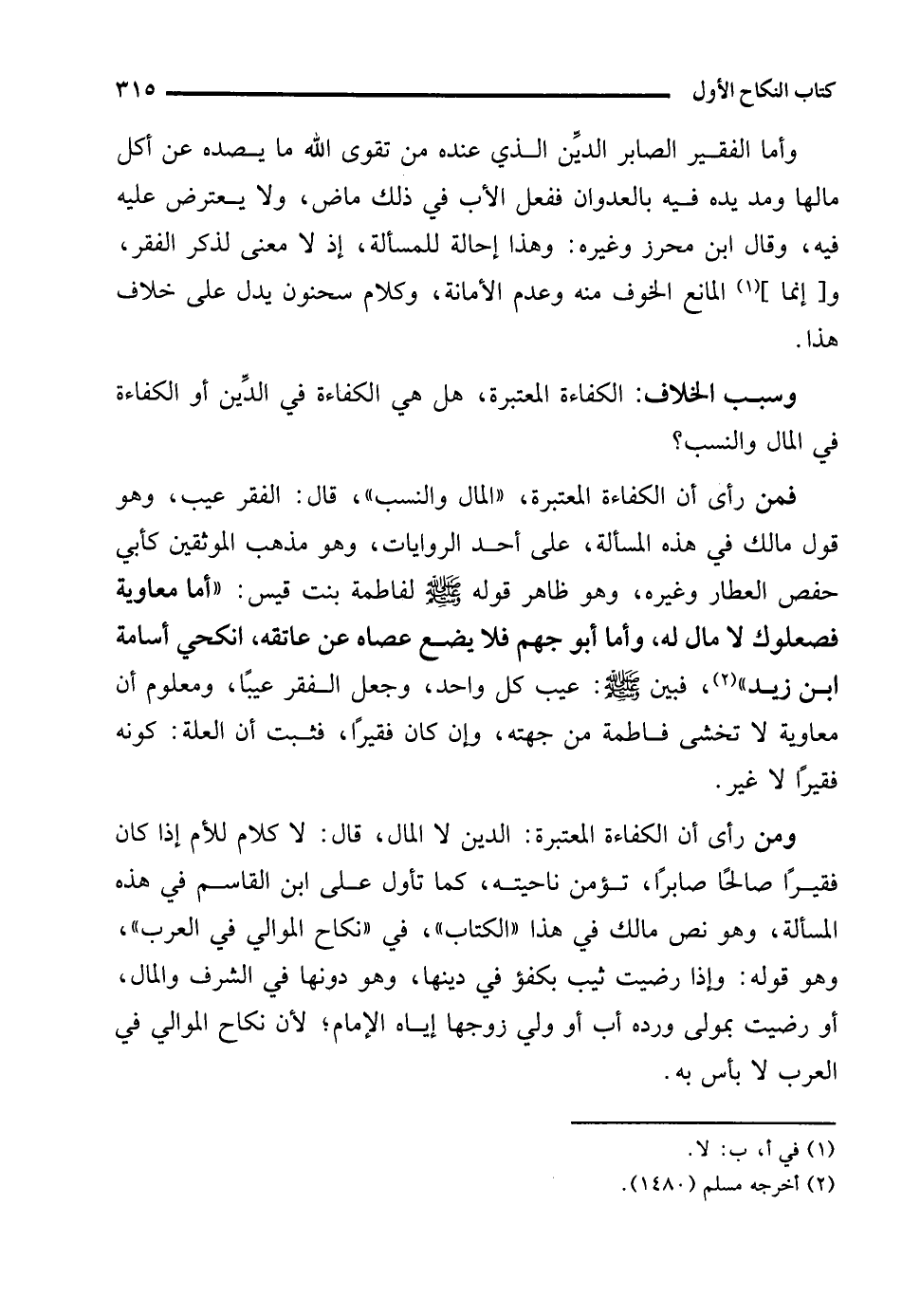 فمن رأى أن الكفاءة المعتبرة، "المال والنسب"، قال: الفقر عيب، وهو قول مالك في هذه المسألة، على أحد الروايات، وهو مذهب الموثقين كأبي حفص العطار وغيره، وهو ظاهر قوله - صلى الله عليه وسلم - لفاطمة بنت قيس: "أما معاوية فصعلوك لا مال له، وأما أبو جهم فلا يضع عصاه عن عاتقه، انكحي أسامة ابن زيد" (¬2)، فبين - صلى الله عليه وسلم -: عيب كل واحد، وجعل الفقر عيبًا، ومعلوم أن معاوية لا تخشى فاطمة من جهته، وإن كان فقيرًا، فثبت أن العلة: كونه فقيرًا لا غير.