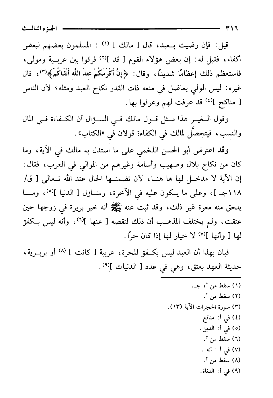 فبان بهذا أن العبد ليس بكفؤ للحرة، عربية [كانت] (¬8) أو بربرية، حديثة العهد بعتق، وهي في عدد [الدنيات] (¬9).