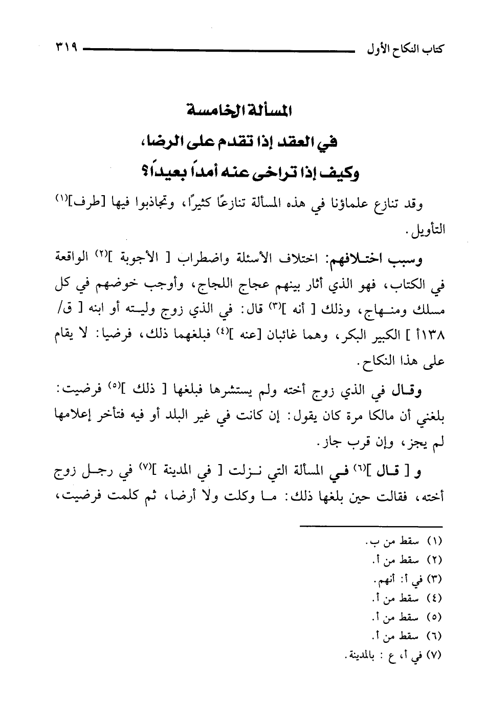 المسألة الخامسة في العقد إذا تقدم على الرضا، وكيف إذا تراخى عنه أمدًا بعيدًا؟