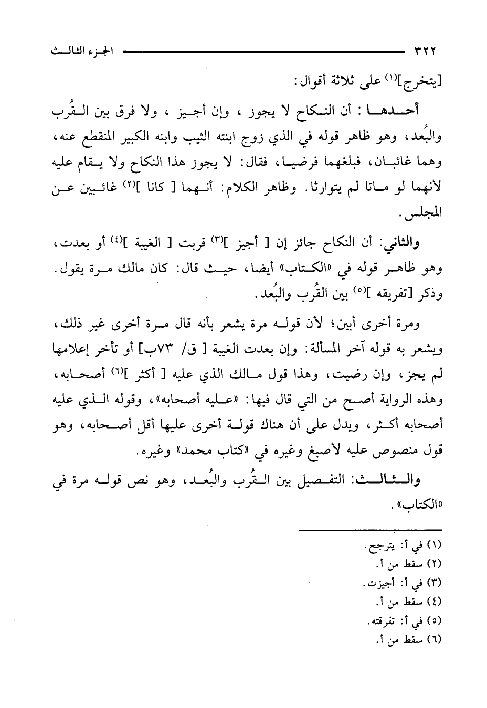 والثالث: التفصيل بين القُرب والبُعد، وهو نص قوله مرة في "الكتاب".