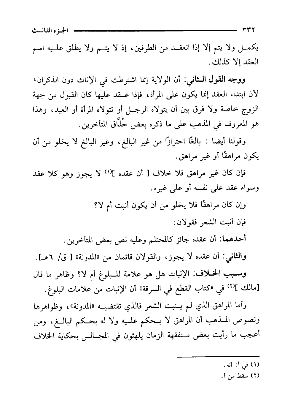 وأما المراهق الذي لم ينبت الشعر فالذي تقتضيه "المدونة"، وظواهرها ونصوص المذهب أن المراهق لا يحكم عليه ولا له بحكم البالغ، ومن أعجب ما رأيت بعض متفقهة الزمان يلهثون في المجالس بحكاية الخلاف