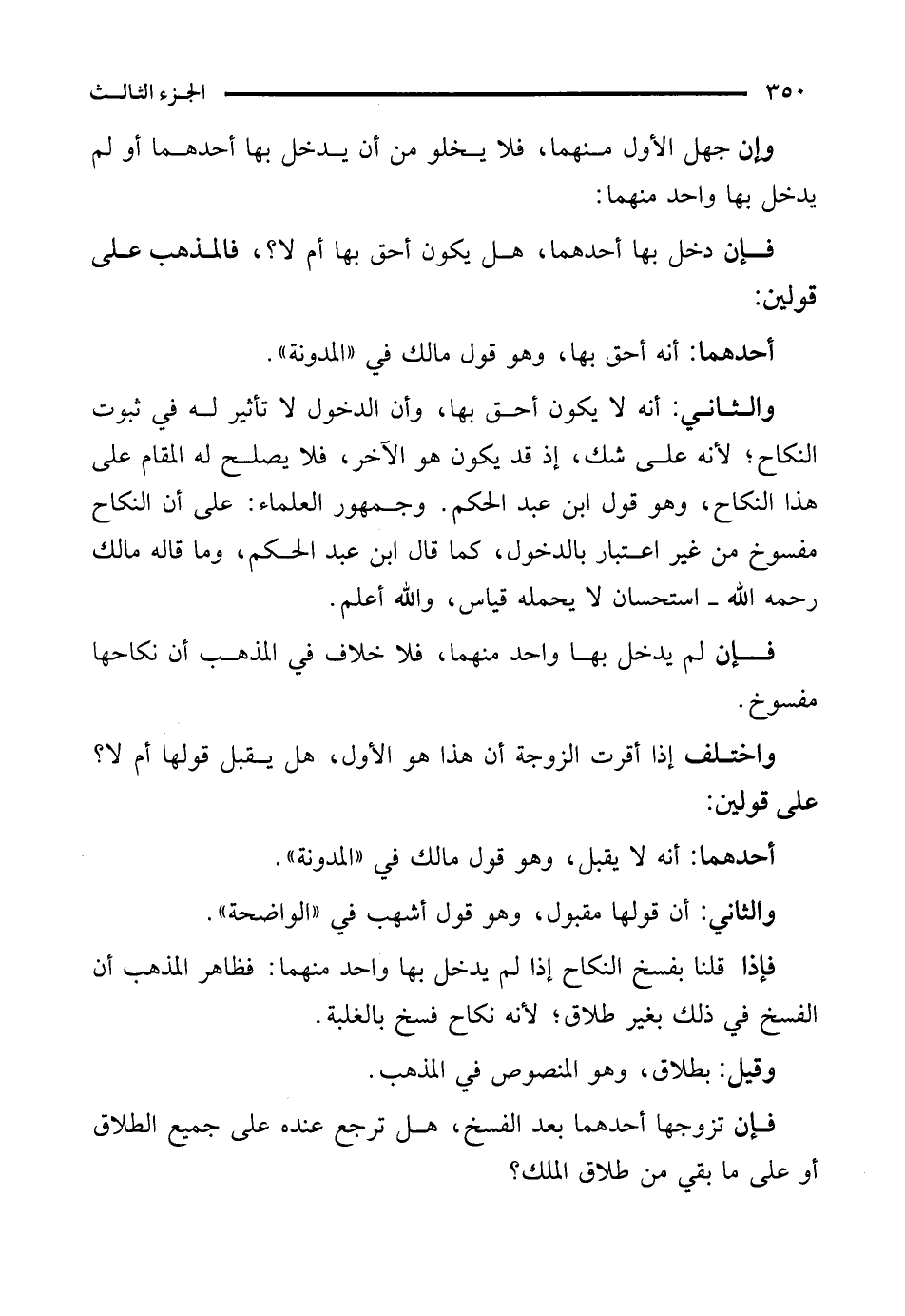 والثاني: أنه لا يكون أحق بها، وأن الدخول لا تأثير له في ثبوت النكاح؛ لأنه على شك، إذ قد يكون هو الآخر، فلا يصلح له المقام على هذا النكاح، وهو قول ابن عبد الحكم. وجمهور العلماء: على أن النكاح مفسوخ من غير اعتبار بالدخول، كما قال ابن عبد الحكم، وما قاله مالك رحمه الله - استحسان لا يحمله قياس، والله أعلم.