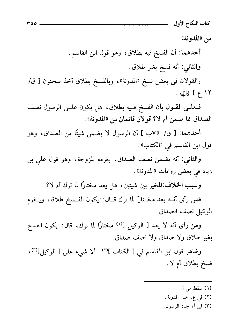 والقولان في بعض نسخ "المدونة"، وبالفسخ بطلاق أخذ سحنون - رضي الله عنه -.