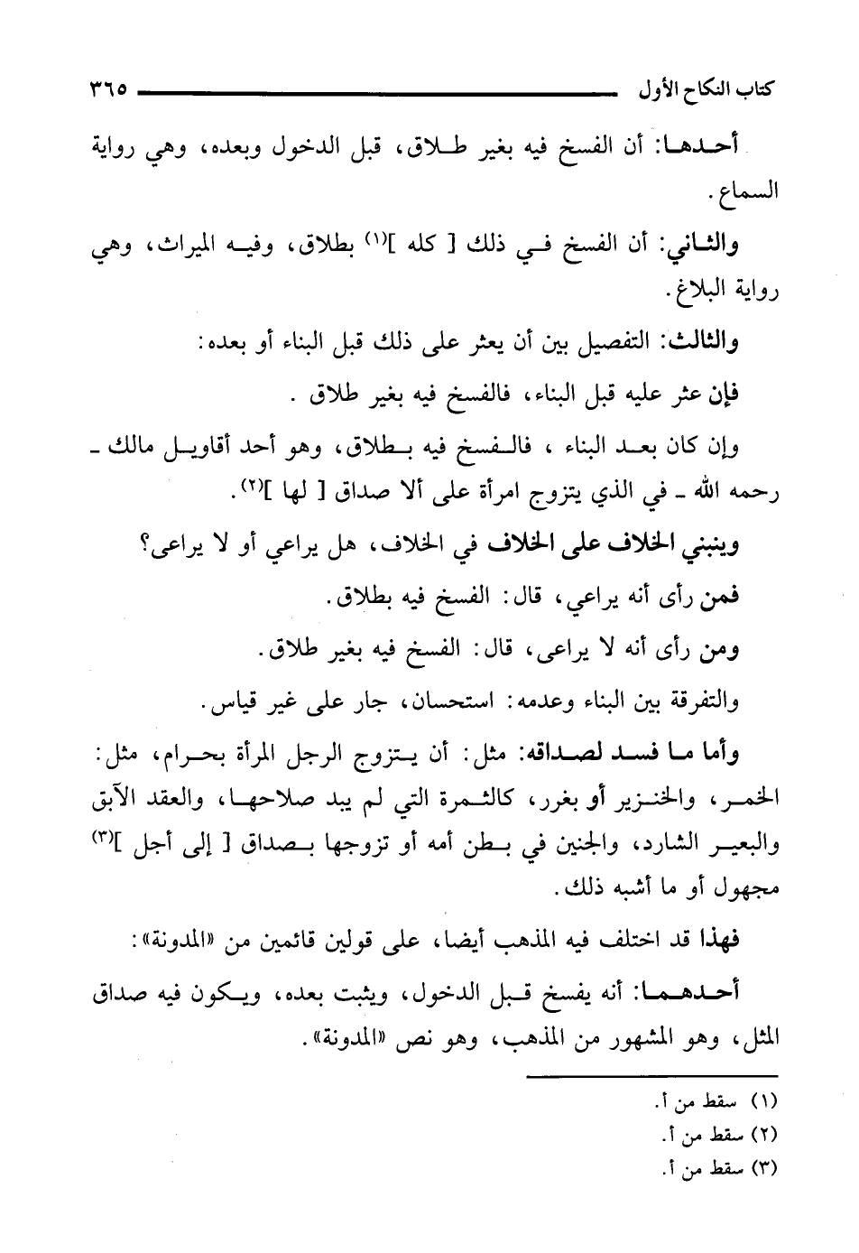 وإن كان بعد البناء، فالفسخ فيه بطلاق، وهو أحد أقاويل مالك -رحمه الله- في الذي يتزوج امرأة على ألا صداق [لها] (¬2).