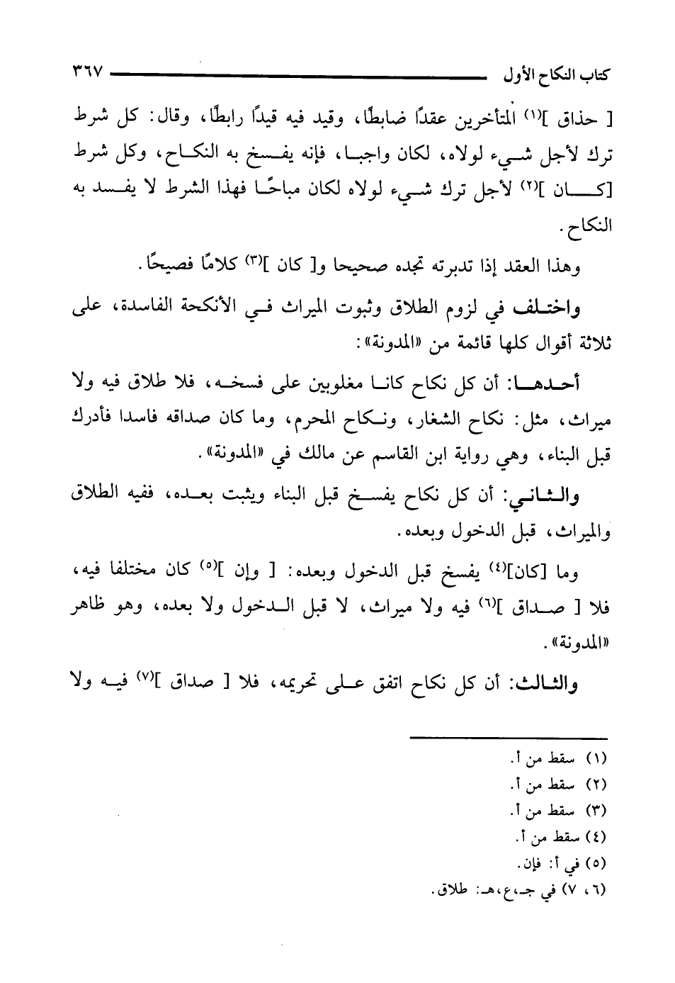 واختلف في لزوم الطلاق وثبوت الميراث في الأنكحة الفاسدة، على ثلاثة أقوال كلها قائمة من "المدونة":