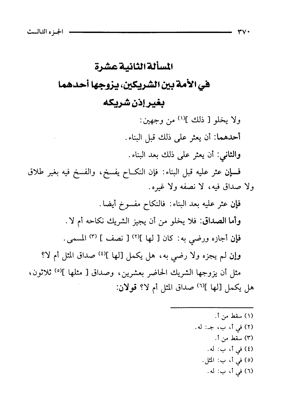 المسألة الثانية عشرة في الأمة بين الشريكين، يزوجها أحدهما بغير إذن شريكه