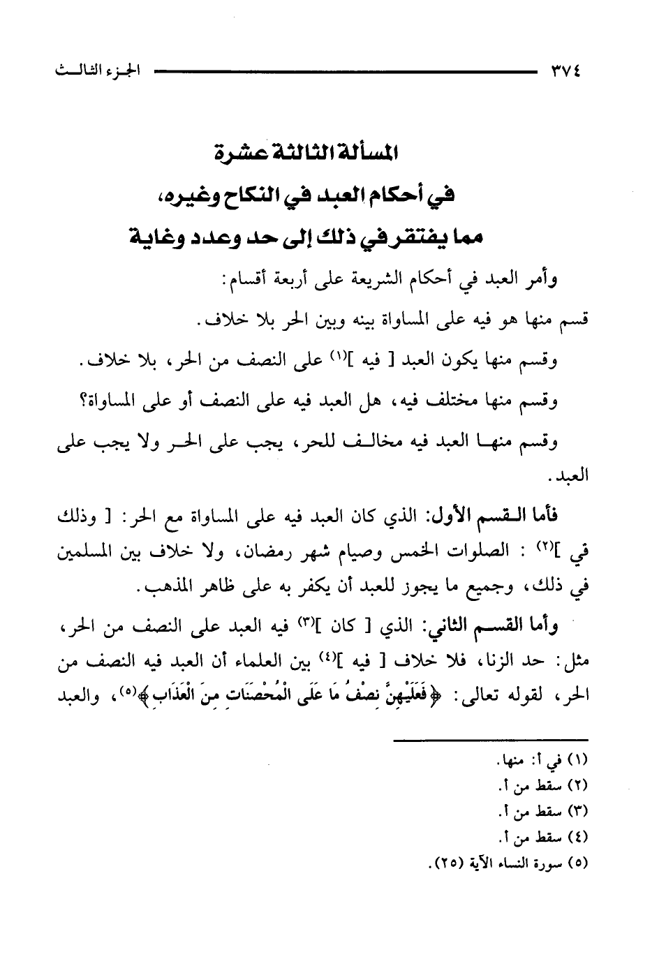 المسألة الثالثة عشرة في أحكام العبد في النكاح وغيره، مما يفتقر في ذلك إلى حد وعدد وغاية