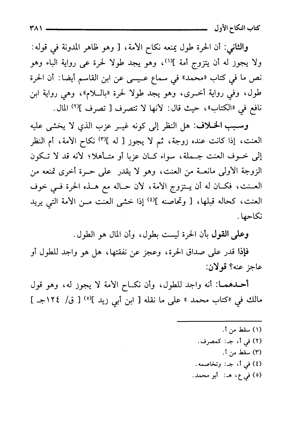 والثاني: أن الحرة طول يمنعه نكاح الأمة، [وهو ظاهر المدونة في قوله: ولا يجوز له أن يتزوج أمة] (¬1)، وهو يجد طولا لحرة على رواية الباء وهو نص ما في كتاب "محمد" في سماع عيسى عن ابن القاسم أيضًا: أن الحرة طول، وفي رواية أخرى، وهو يجد طولا لحرة "باللام"، وهي رواية ابن نافع في "الكتاب"، حيث قال: لأنها لا تتصرف [تصرف] (¬2) المال.