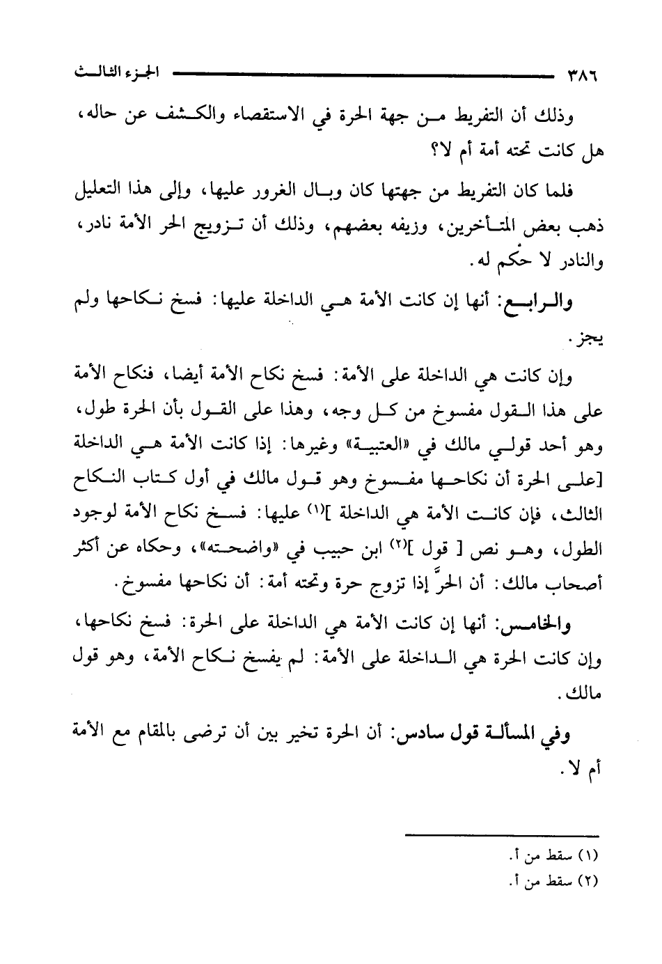 وإن كانت هي الداخلة على الأمة: فسخ نكاح الأمة أيضًا، فنكاح الأمة على هذا القول مفسوخ من كل وجه، وهذا على القول بأن الحرة طول، وهو أحد قولي مالك في "العتبية" وغيرها: إذا كانت الأمة هي الداخلة [على الحرة أن نكاحها مفسوخ وهو قول مالك في أول كتاب النكاح الثالث، فإن كانت الأمة هي الداخلة] (¬1) عليها: فسخ نكاح الأمة لوجود الطول، وهو نص [قول] (¬2) ابن حبيب في "واضحته"، وحكاه عن أكثر أصحاب مالك: أن الحرَّ إذا تزوج حرة وتحته أمة: أن نكاحها مفسوخ.