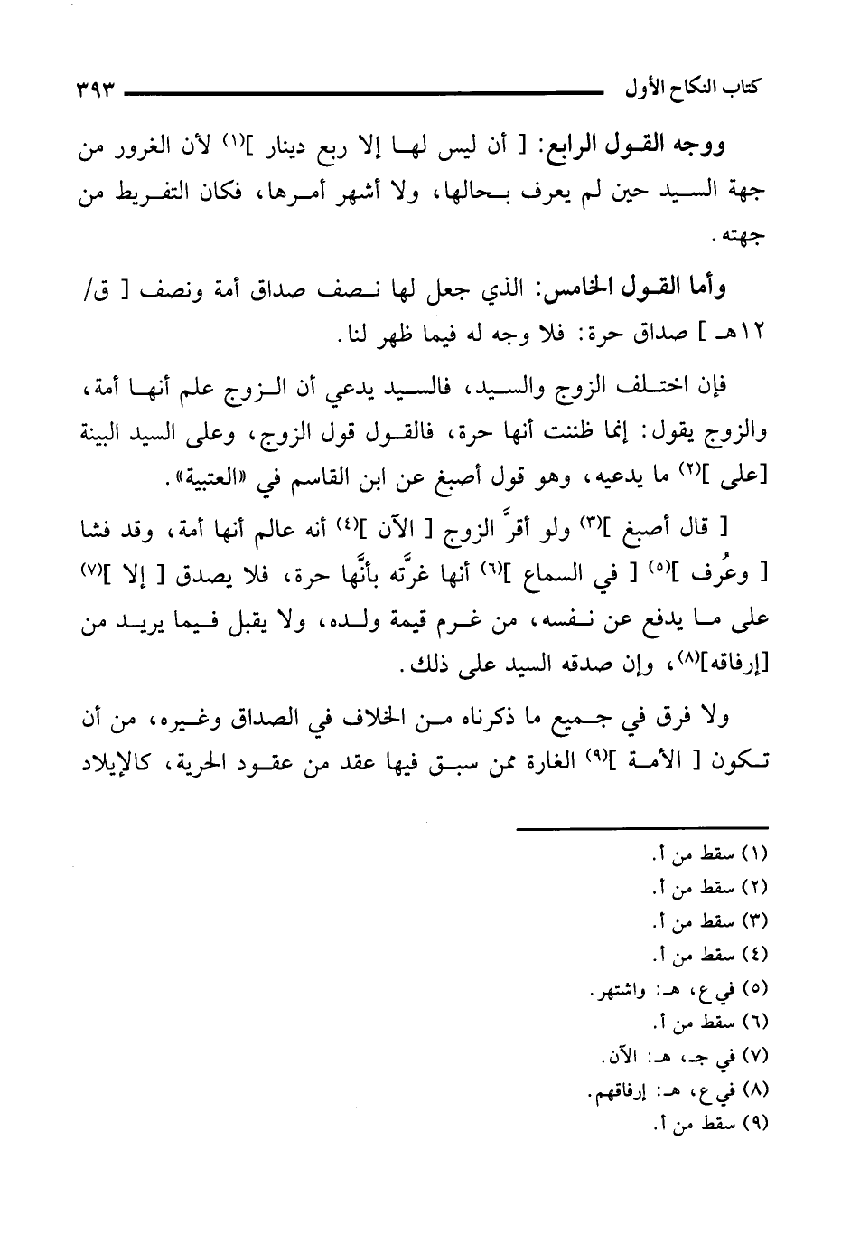 ووجه القول الرابع: [أن ليس لها إلا ربع دينار] (¬1) لأن الغرور من جهة السيد حين لم يعرف بحالها، ولا أشهر أمرها، فكان التفريط من جهته.