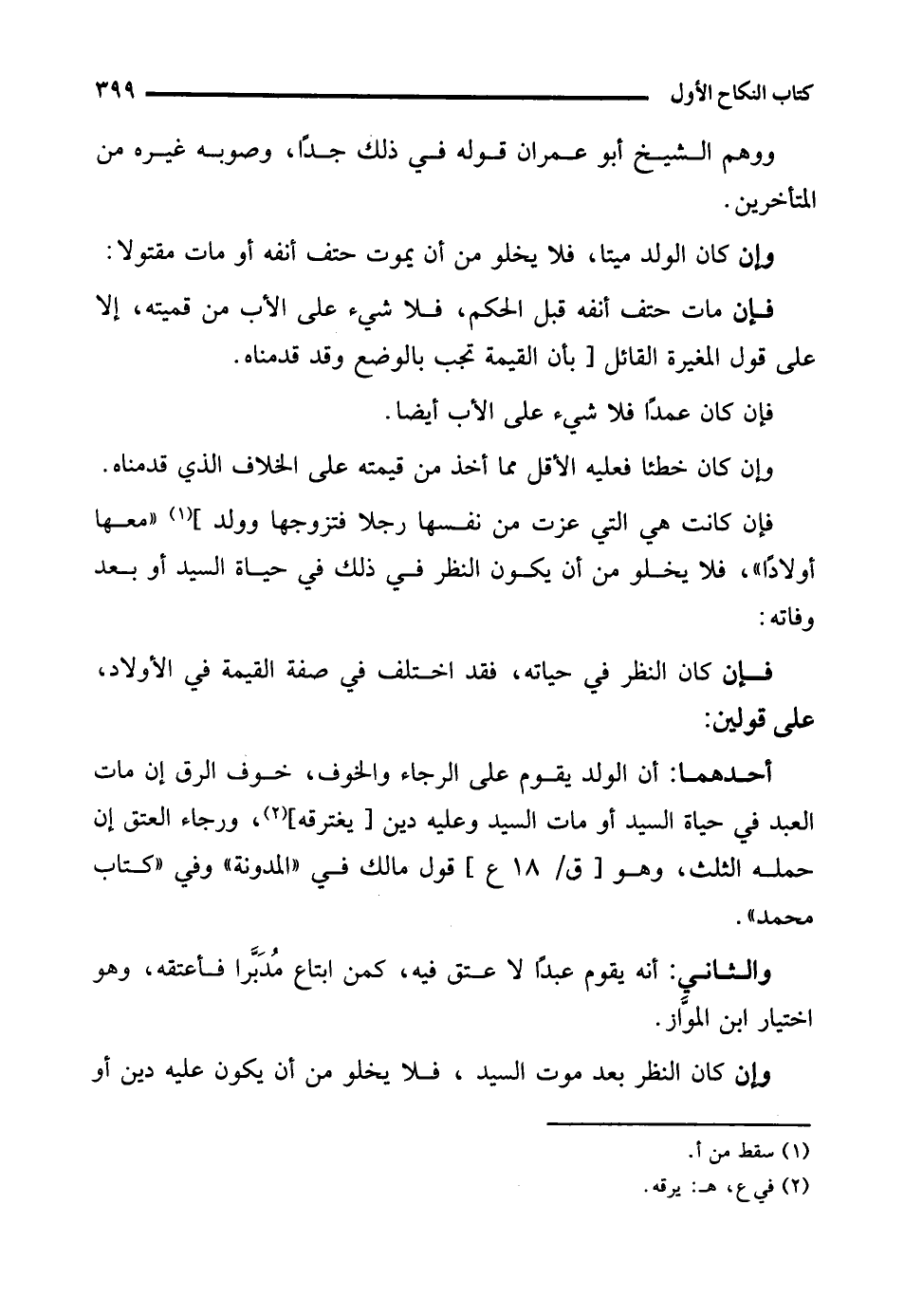 أحدهما: أن الولد يقوم على الرَّجاء والخوف، خوف الرق إن مات العبد في حياة السيد أو مات السيد وعليه دين [يغترقه] (¬2)، ورجاء العتق إن حمله الثلث، وهو قول مالك في "المدونة" وفي "كتاب محمد".