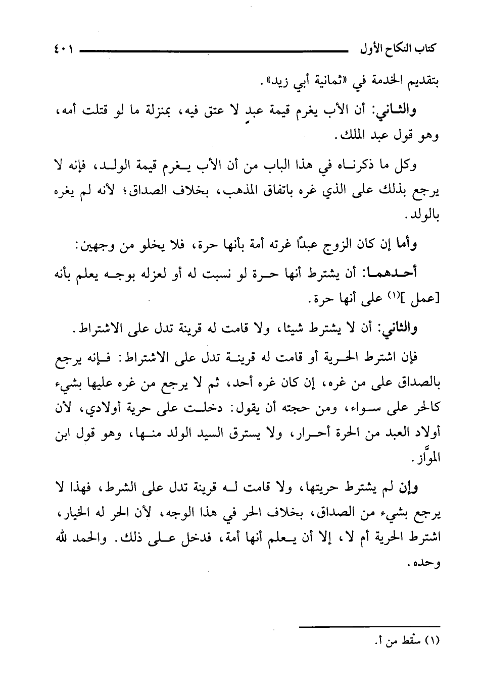 وإن لم يشترط حريتها، ولا قامت له قرينة تدل على الشرط، فهذا لا يرجع بشيء من الصداق، بخلاف الحر في هذا الوجه، لأن الحر له الخيار، اشترط الحرية أم لا، إلا أن يعلم أنها أمة، فدخل على ذلك. والحمد لله وحده.