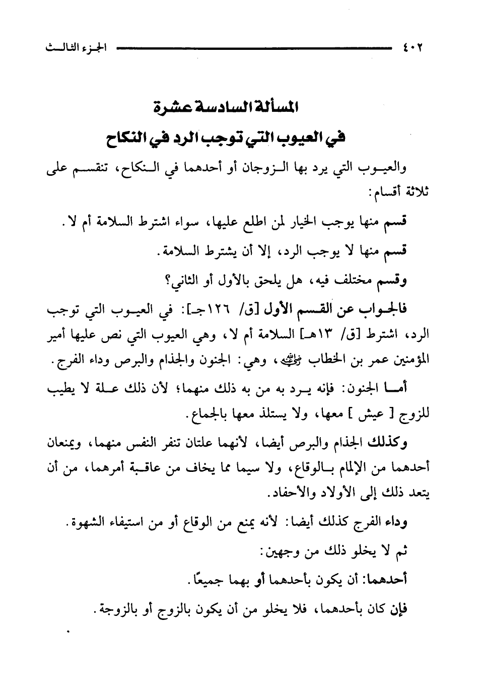 فالجواب عن القسم الأول: في العيوب التي توجب الرد، اشترط السلامة أم لا، وهي العيوب التي نص عليها أمير المؤمنين عمر بن الخطاب - رضي الله عنه -، وهي: الجنون والجذام والبرص وداء الفرج.