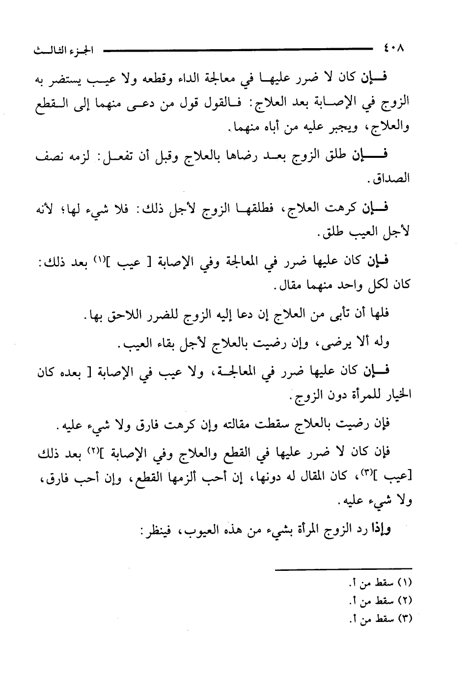 فإن كان لا ضرر عليها في معالجة الداء وقطعه ولا عيب يستضر به الزوج في الإصابة بعد العلاج: فالقول قول من دعى منهما إلى القطع والعلاج، ويجبر عليه من أباه منهما.