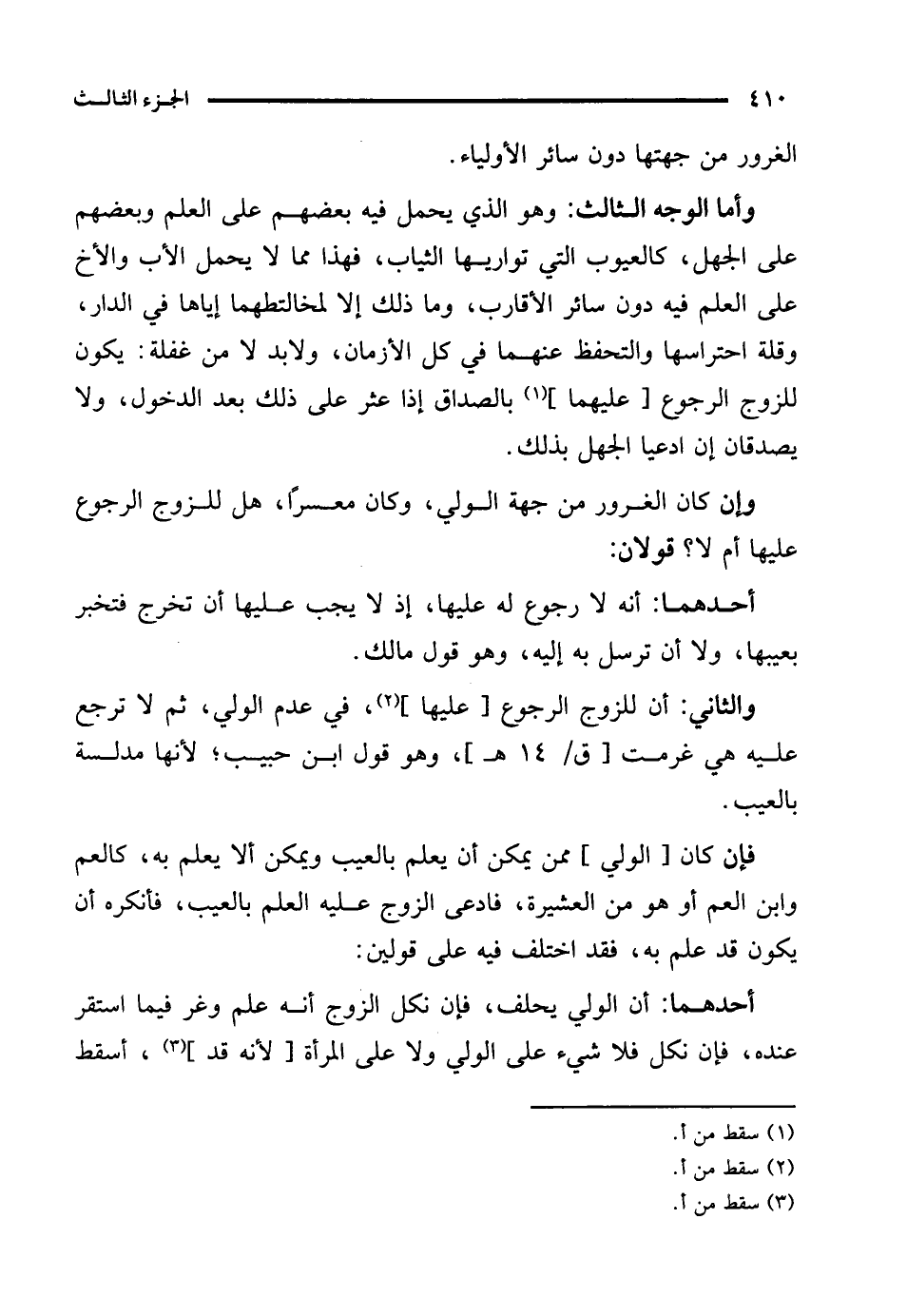 وأما الوجه الثالث: وهو الذي يحمل فيه بعضهم على العلم وبعضهم على الجهل، كالعيوب التي تواريها الثياب، فهذا مما لا يحمل الأب والأخ على العلم فيه دون سائر الأقارب، وما ذلك إلا لمخالتطهما إياها في الدار، وقلة احتراسها والتحفظ عنهما في كل الأزمان، ولابد لا من غفلة: يكون للزوج الرجوع [عليهما] (¬1) بالصداق إذا عثر على ذلك بعد الدخول، ولا يصدقان إن ادعيا الجهل بذلك.