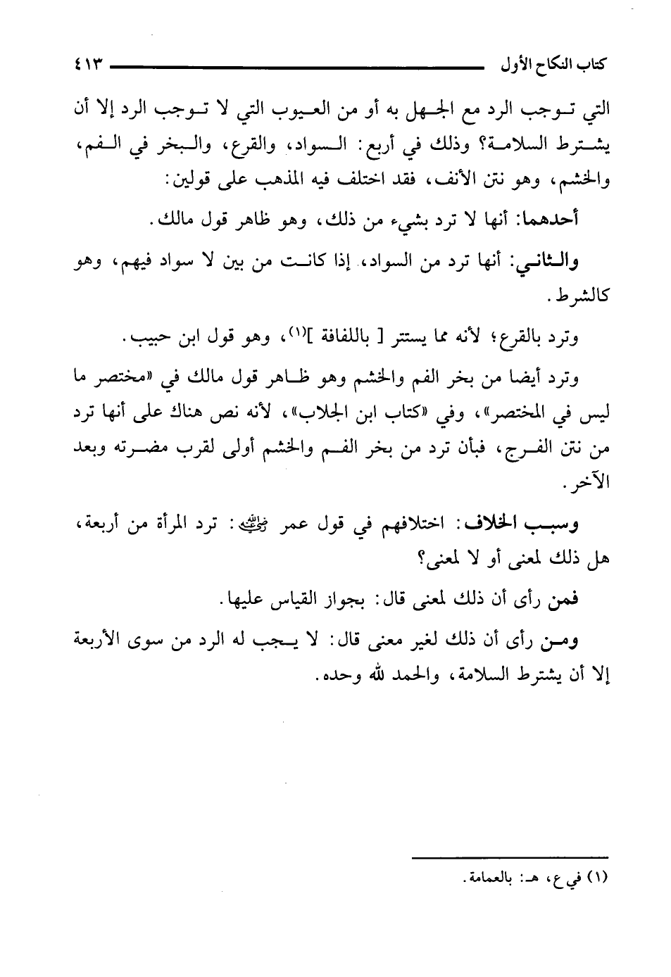 التي توجب الرد مع الجهل به أو من العيوب التي لا توجب الرد إلا أن يشترط السلامة؟ وذلك في أربع: السواد، والقرع، والبخر في الفم، والخشم، وهو نتن الأنف، فقد اختلف فيه المذهب على قولين: