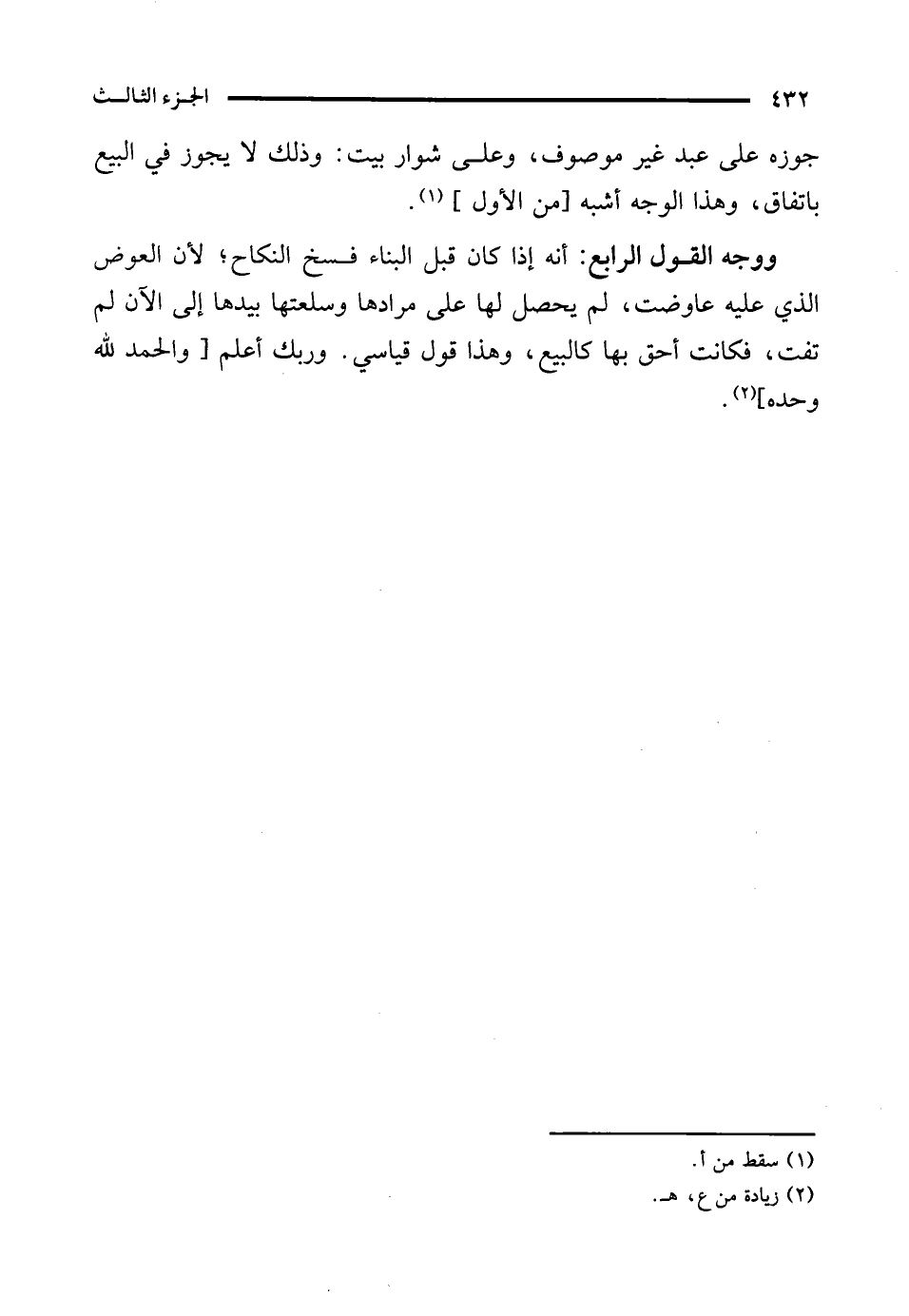 ووجه القول الرابع: أنه إذا كان قبل البناء فسخ النكاح؛ لأن العوض الذي عليه عاوضت، لم يحصل لها على مرادها وسلعتها بيدها إلى الآن لم تفت، فكانت أحق بها كالبيع، وهذا قول قياسي. وربك أعلم [والحمد لله وحده] (¬2).