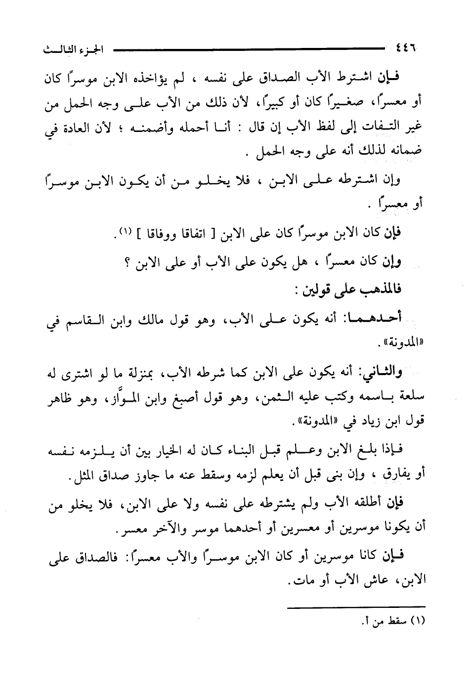 والثاني: أنه يكون على الابن كما شرطه الأب، بمنزلة ما لو اشترى له سلعة باسمه وكتب عليه الثمن، وهو قول أصبغ وابن الموَّاز، وهو ظاهر قول ابن زياد في "المدونة".