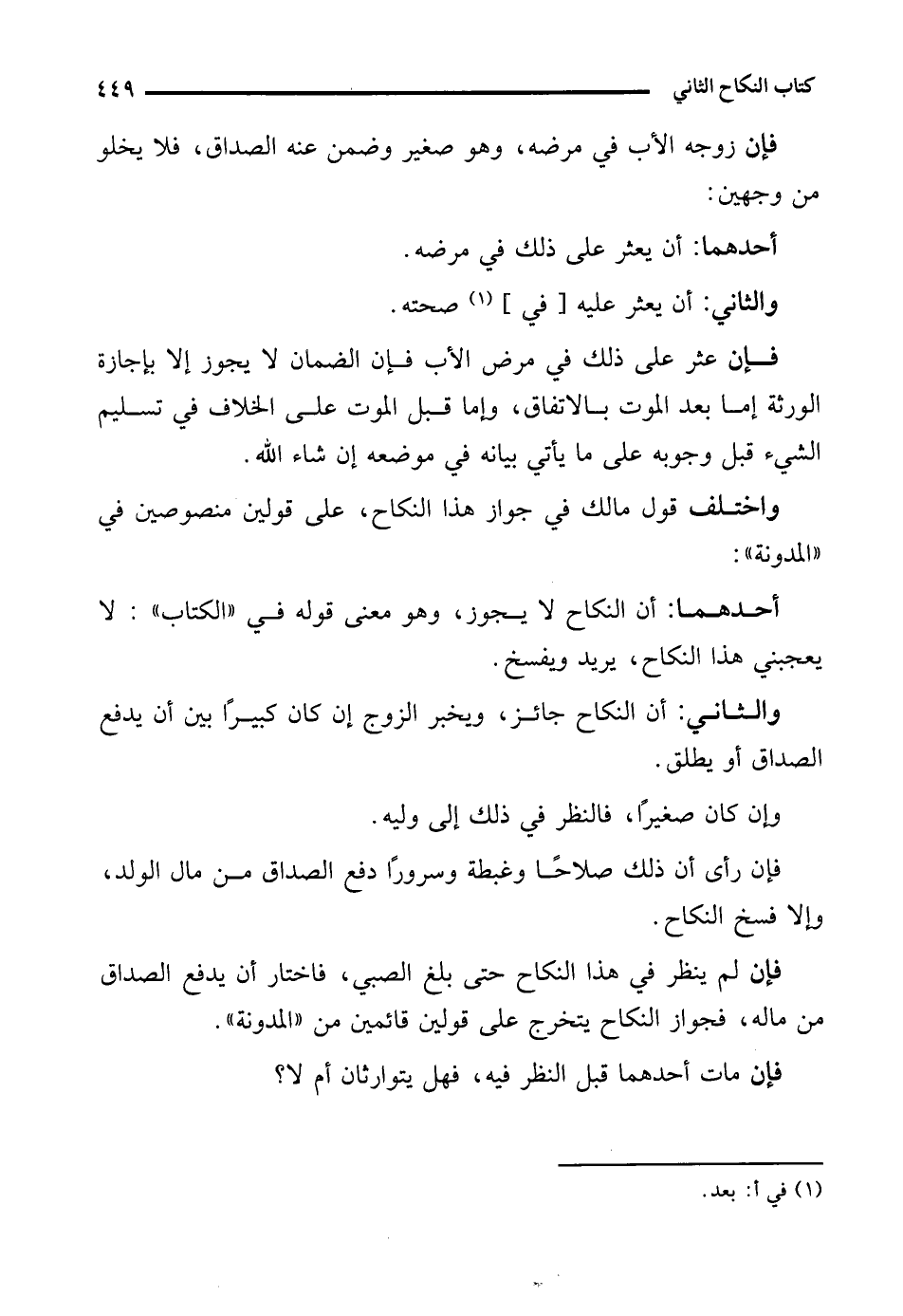 واختلف قول مالك في جواز هذا النكاح، على قولين منصوصين في "المدونة":