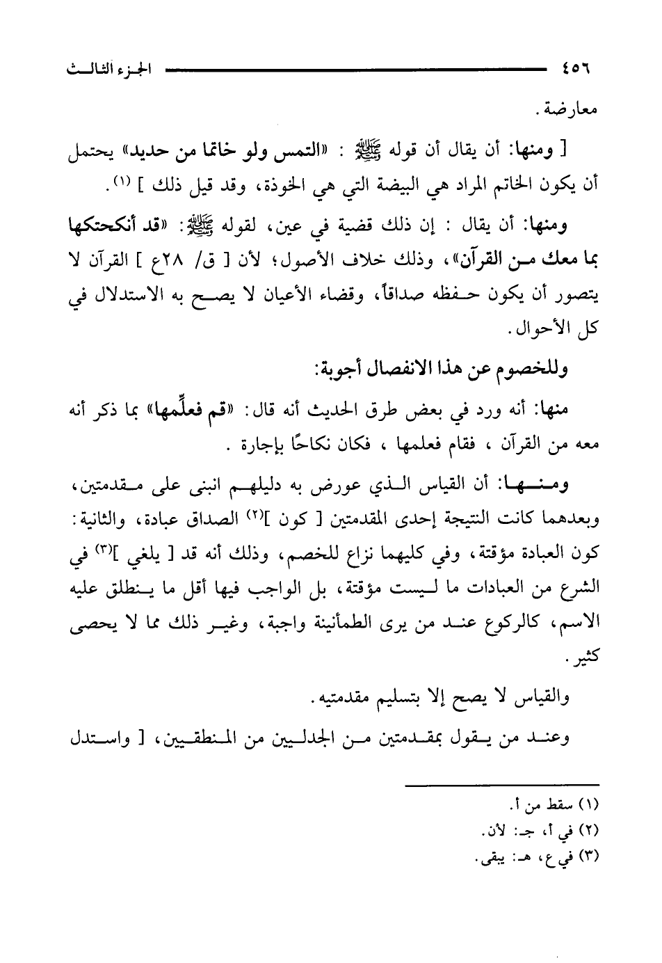ومنها: أن القياس الذي عورض به دليلهم انبنى على مقدمتين، وبعدهما كانت النتيجة إحدى المقدمتين [كون] (¬2) الصداق عبادة، والثانية: كون العبادة مؤقتة، وفي كليهما نزاع للخصم، وذلك أنه قد [يلغي] (¬3) في الشرع من العبادات ما ليست مؤقتة، بل الواجب فيها أقل ما ينطلق عليه الاسم، كالركوع عند من يرى الطمأنينة واجبة، وغير ذلك مما لا يحصى كثير.