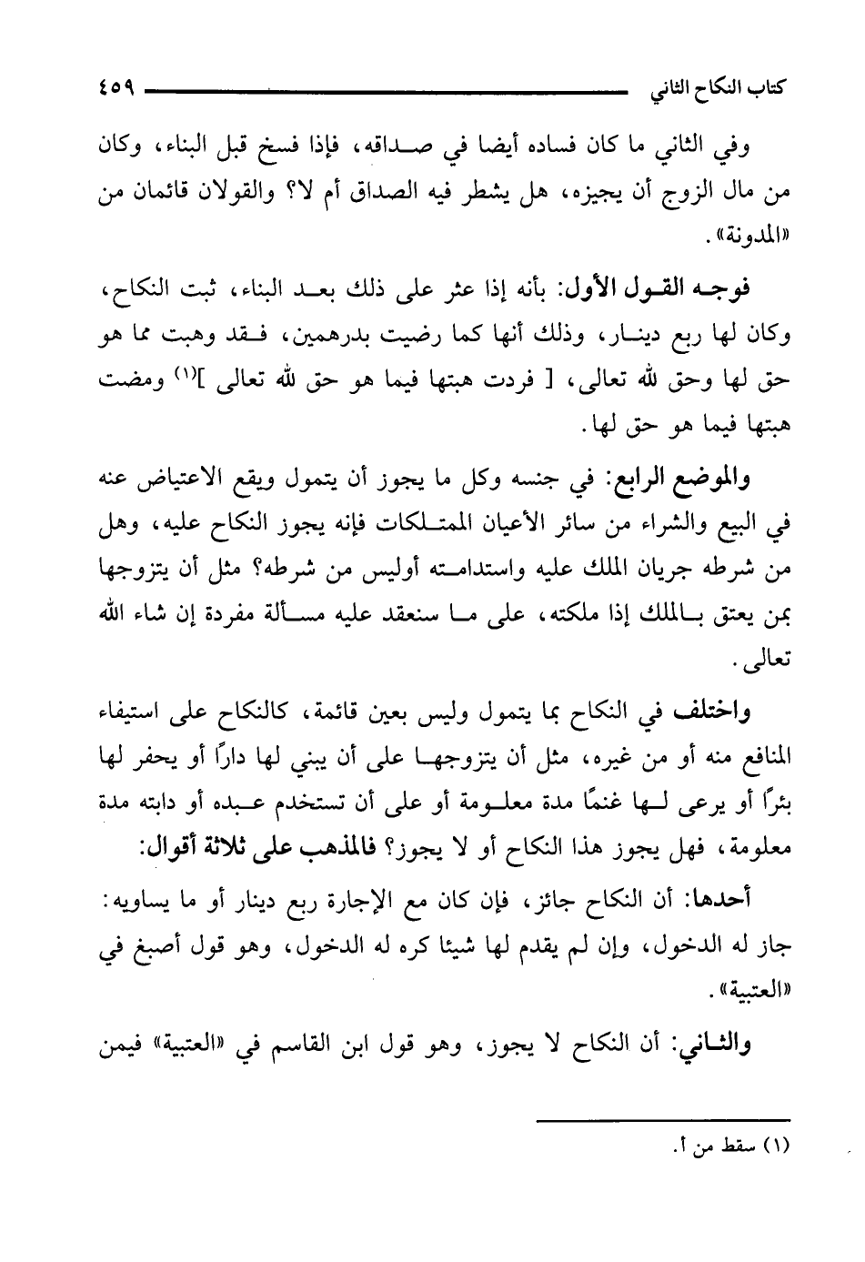 وفي الثاني ما كان فساده أيضًا في صداقه، فإذا فسخ قبل البناء، وكان من مال الزوج أن يجيزه، هل يشطر فيه الصداق أم لا؟ والقولان قائمان من "المدونة".