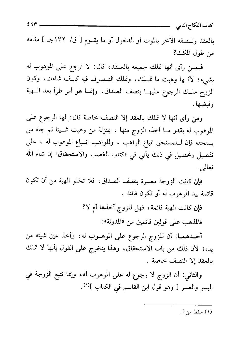ومن رأى أنها لا تملك بالعقد إلا النصف خاصة قال: لها الرجوع على الموهوب له بقدر ما أخذه الزوج منها، بمنزلة من وهبت شيئًا ثم جاء من يستحقه فإن للمستحق اتباع الواهب، وللواهب اتباع الموهوب له، على تفصيل وتحصيل في ذلك يأتي في "كتاب الغصب والاستحقاق" إن شاء الله تعالى.