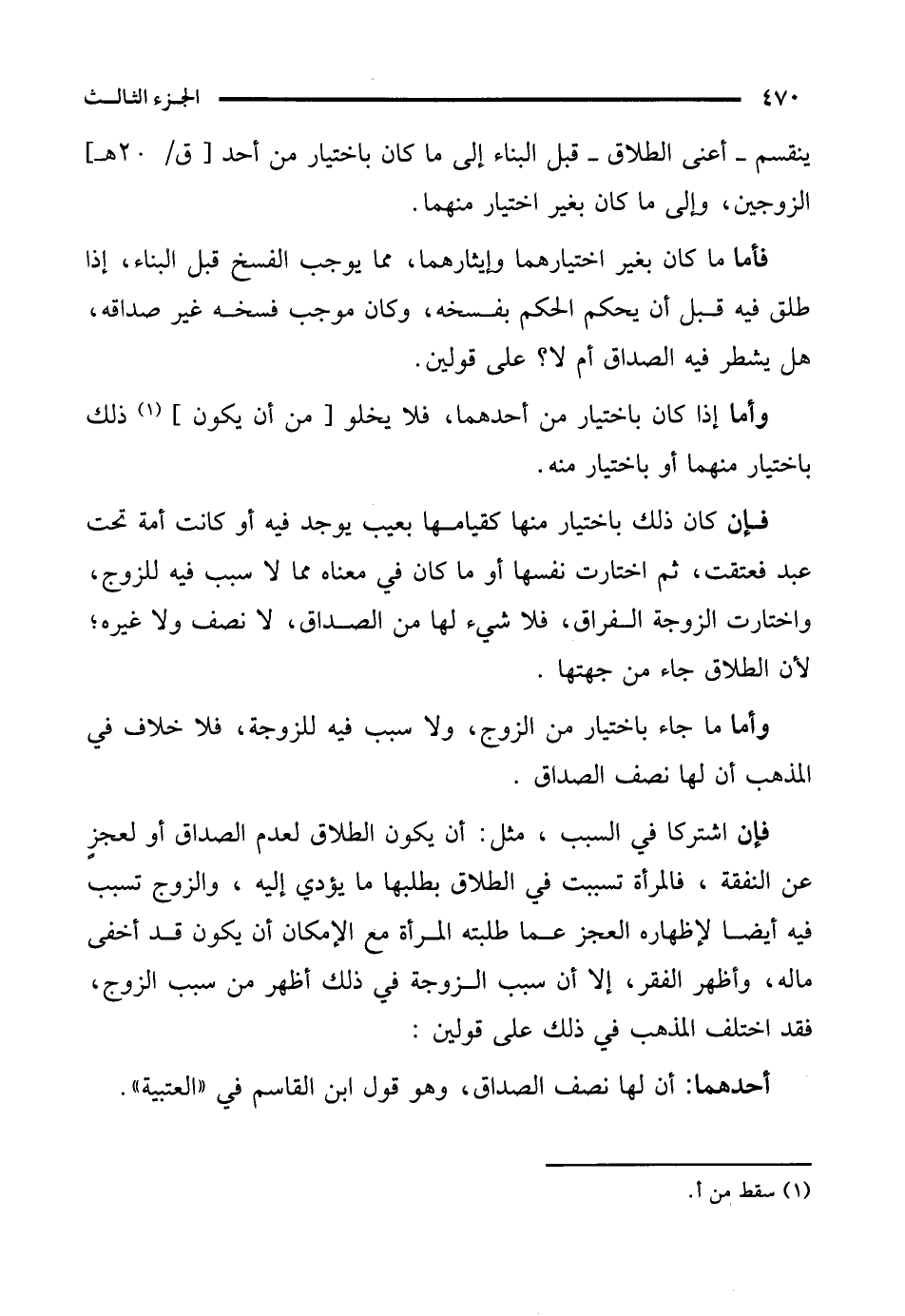 فأما ما كان بغير اختيارهما وإيثارهما، مما يوجب الفسخ قبل البناء، إذا طلق فيه قبل أن يحكم الحكم بفسخه، وكان موجب فسخه غير صداقه، هل يشطر فيه الصداق أم لا؟ على قولين.