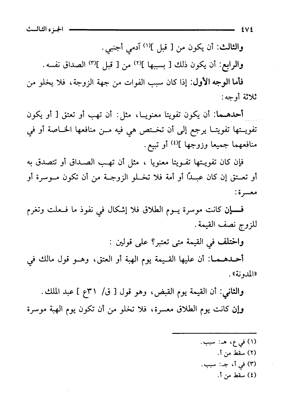 فأما الوجه الأول: إذا كان سبب الفوات من جهة الزوجة، فلا يخلو من ثلاثة أوجه: