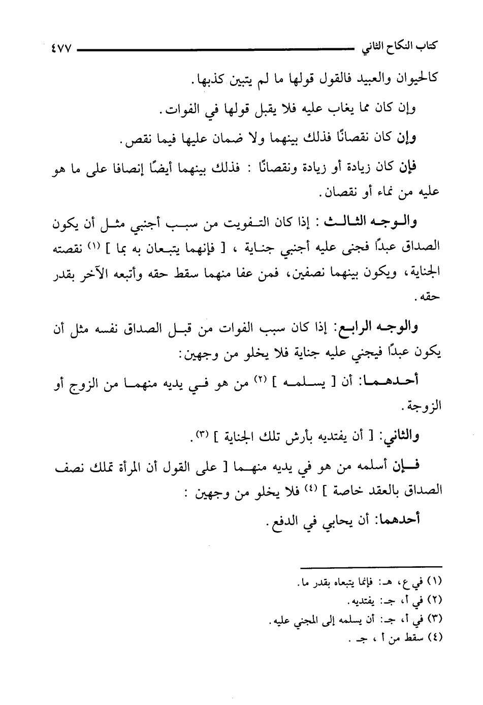 والوجه الرابع: إذا كان سبب الفوات من قبل الصداق نفسه مثل أن يكون عبدًا فيجني عليه جناية فلا يخلو من وجهين:
