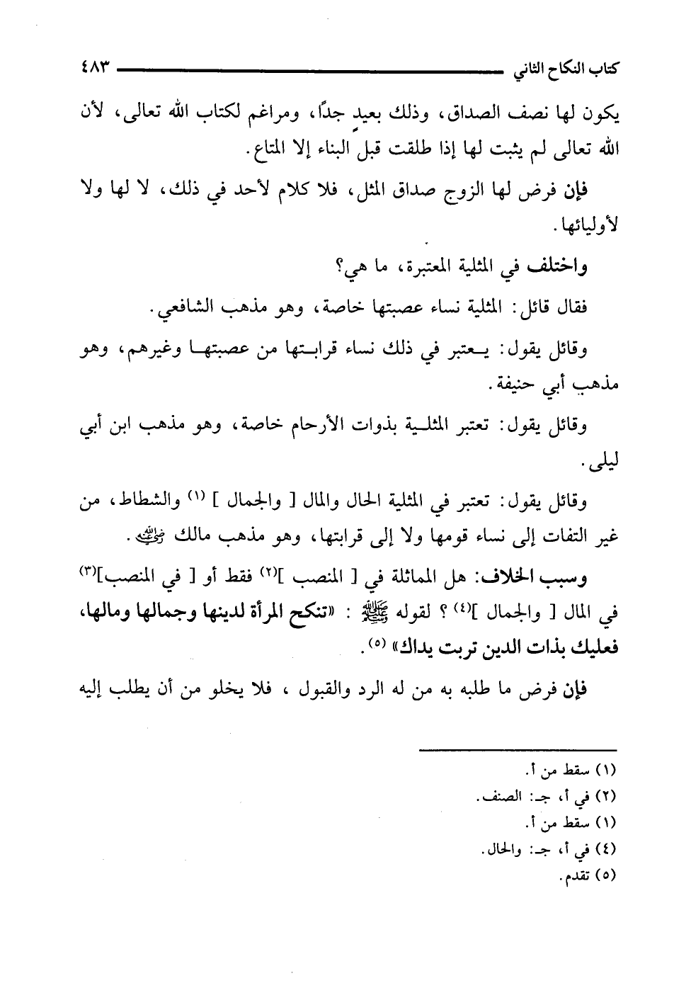 وسبب الخلاف: هل المماثلة في [المنصب] (¬2) فقط أو [في المنصب] (¬3) في المال [والجمال] (¬4)؟ لقوله - صلى الله عليه وسلم -: "تنكح المرأة لدينها وجمالها ومالها، فعليك بذات الدين تربت يداك" (¬5).