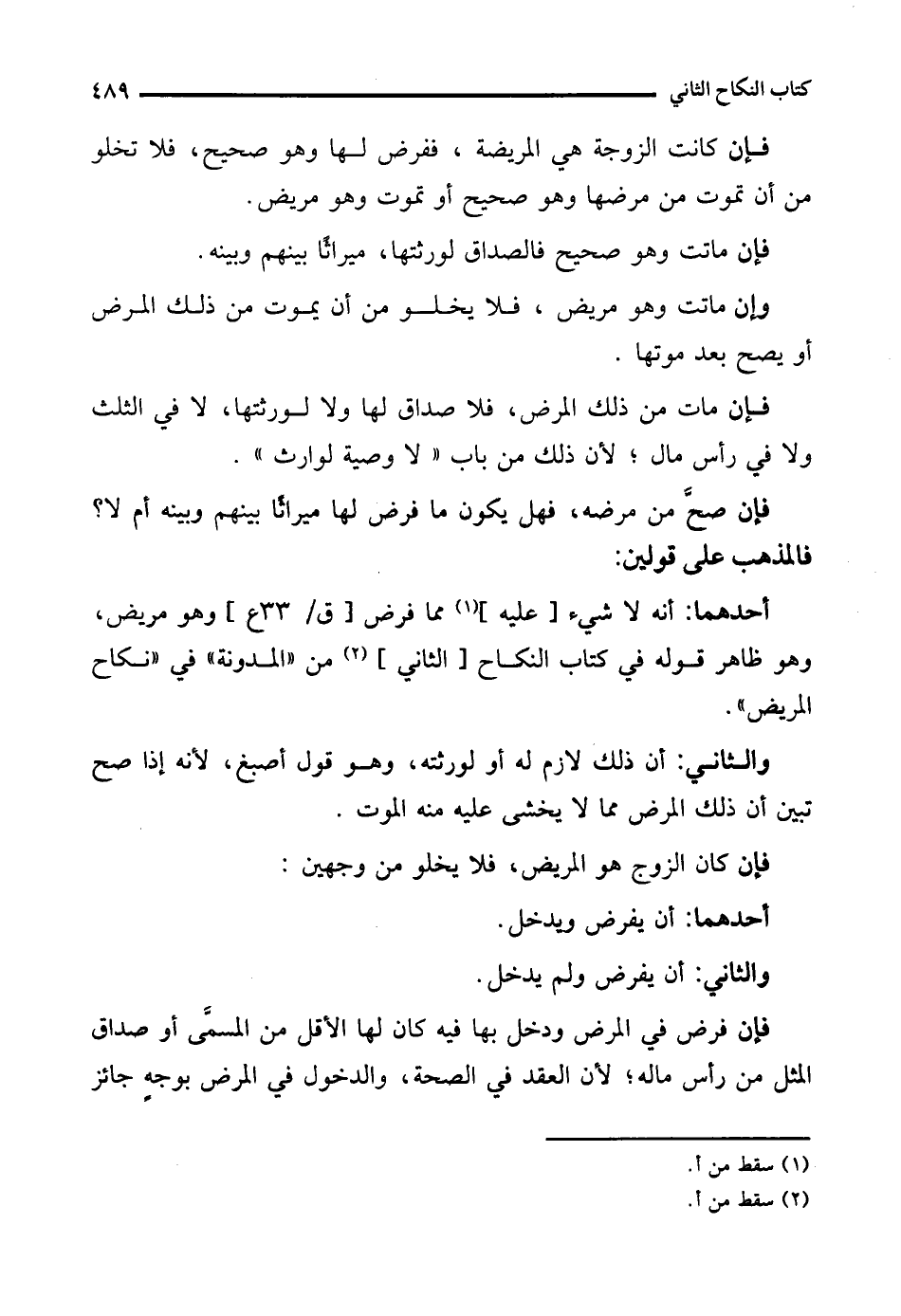 فإن كانت الزوجة هي المريضة، ففرض لها وهو صحيح، فلا تخلو من أن تموت من مرضها وهو صحيح أو تموت وهو مريض.