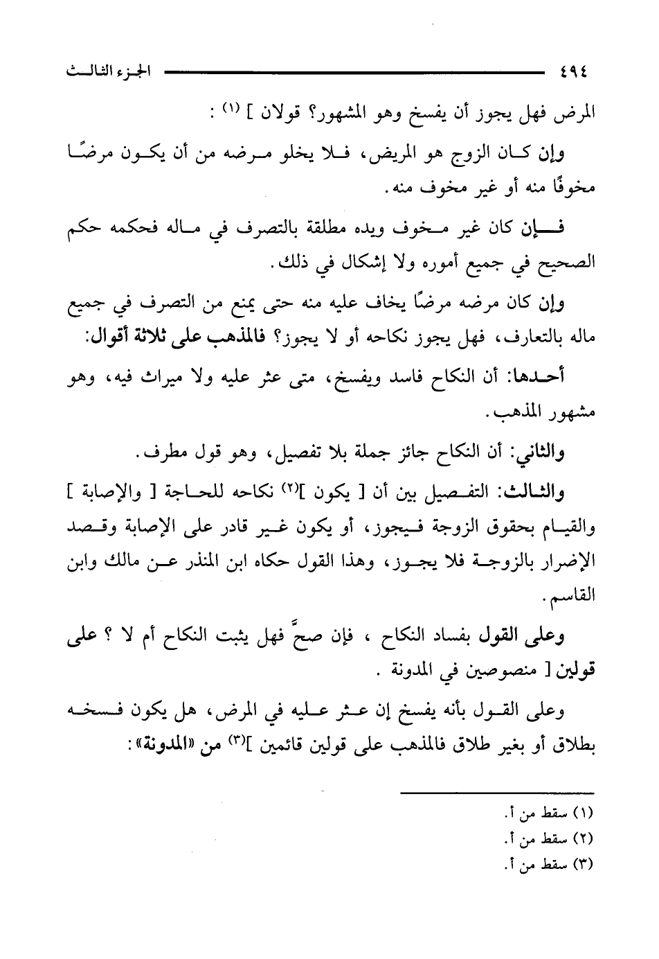 وإن كان مرضه مرضًا يخاف عليه منه حتى يمنع من التصرف في جميع ماله بالتعارف، فهل يجوز نكاحه أو لا يجوز؟ فالمذهب على ثلاثة أقوال: