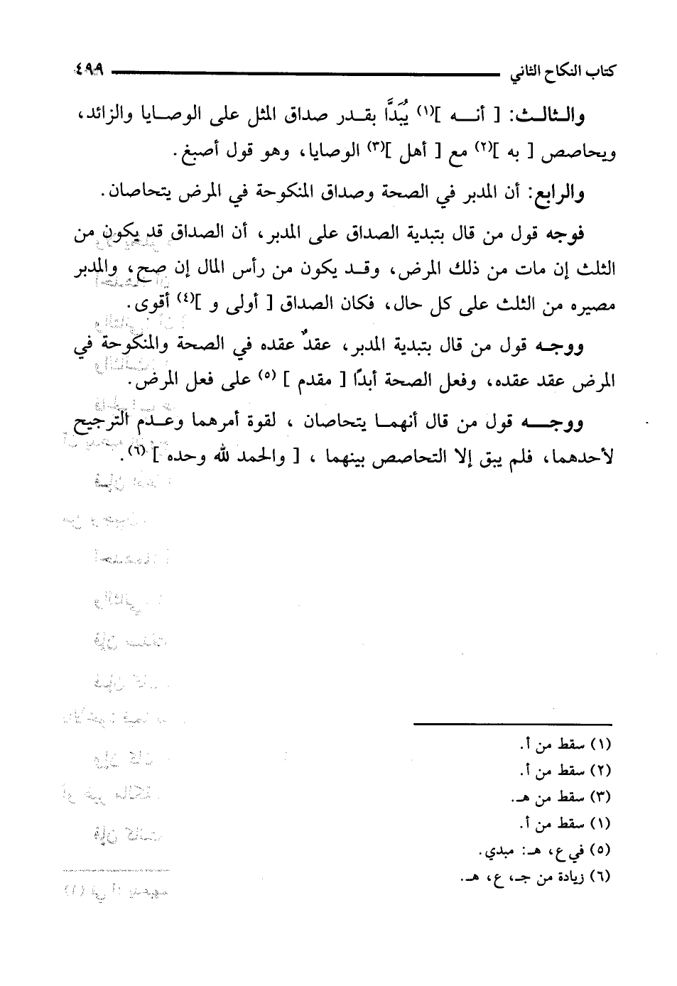 فوجه قول من قال بتبدية الصداق على المدبر، أن الصداق قد يكون من الثلث إن مات من ذلك المرض، وقد يكون من رأس المال إن صح، والمدبر مصيره من الثلث على كل حال، فكان الصداق [أولى و] (¬4) أقوى.