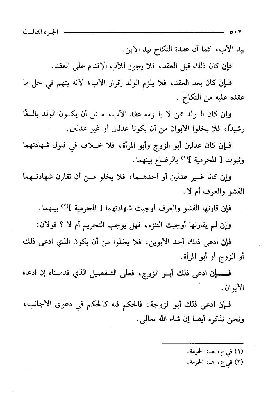 وإن كان الولد ممن لا يلزمه عقد الأب، مثل أن يكون الولد بالغًا رشيدًا، فلا يخلوا الأبوان من أن يكونا عدلين أو غير عدلين.
