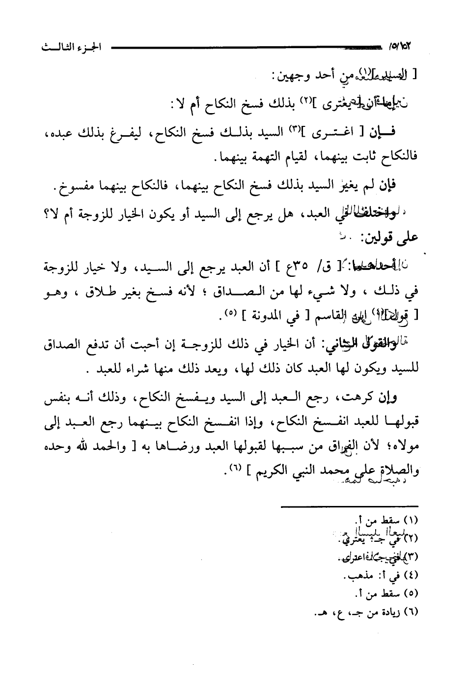 واختلف في العبد، هل يرجع إلى السيد أو يكون الخيار للزوجة أم لا؟ على قولين: