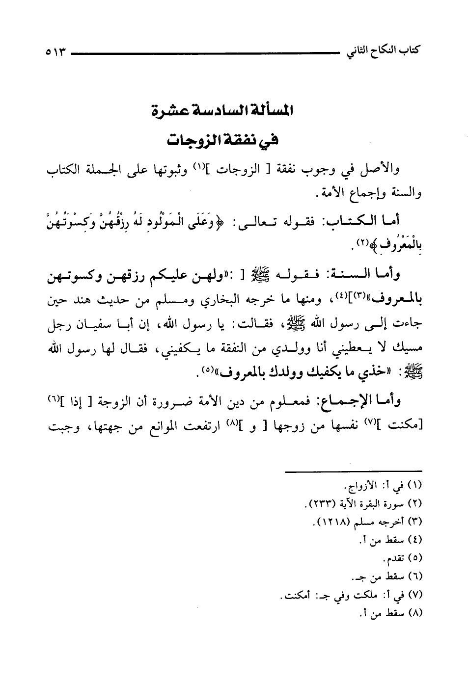 وأما السنة: فقوله - صلى الله عليه وسلم -[: "ولهن عليكم رزقهن وكسوتهن بالمعروف" (¬3)] (¬4)، ومنها ما خرجه البخاري ومسلم من حديث هند حين جاءت إلى رسول الله - صلى الله عليه وسلم -، فقالت: يا رسول الله، إن أبا سفيان رجل مسيك لا يعطيني أنا وولدي من النفقة ما يكفيني، فقال لها رسول الله - صلى الله عليه وسلم -: "خذي ما يكفيك وولدك بالمعروف" (¬5).