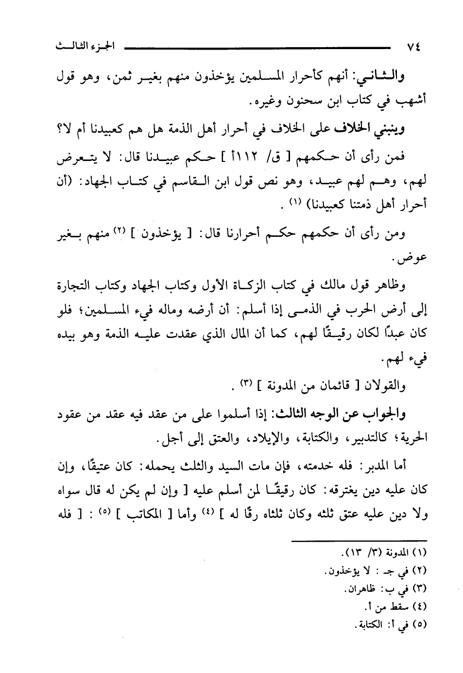 فمن رأى أن حكمهم حكم عبيدنا قال: لا يتعرض لهم، وهم لهم عبيد، وهو نص قول ابن القاسم في كتاب الجهاد: (أن أحرار أهل ذمتنا كعبيدنا) (¬1).
