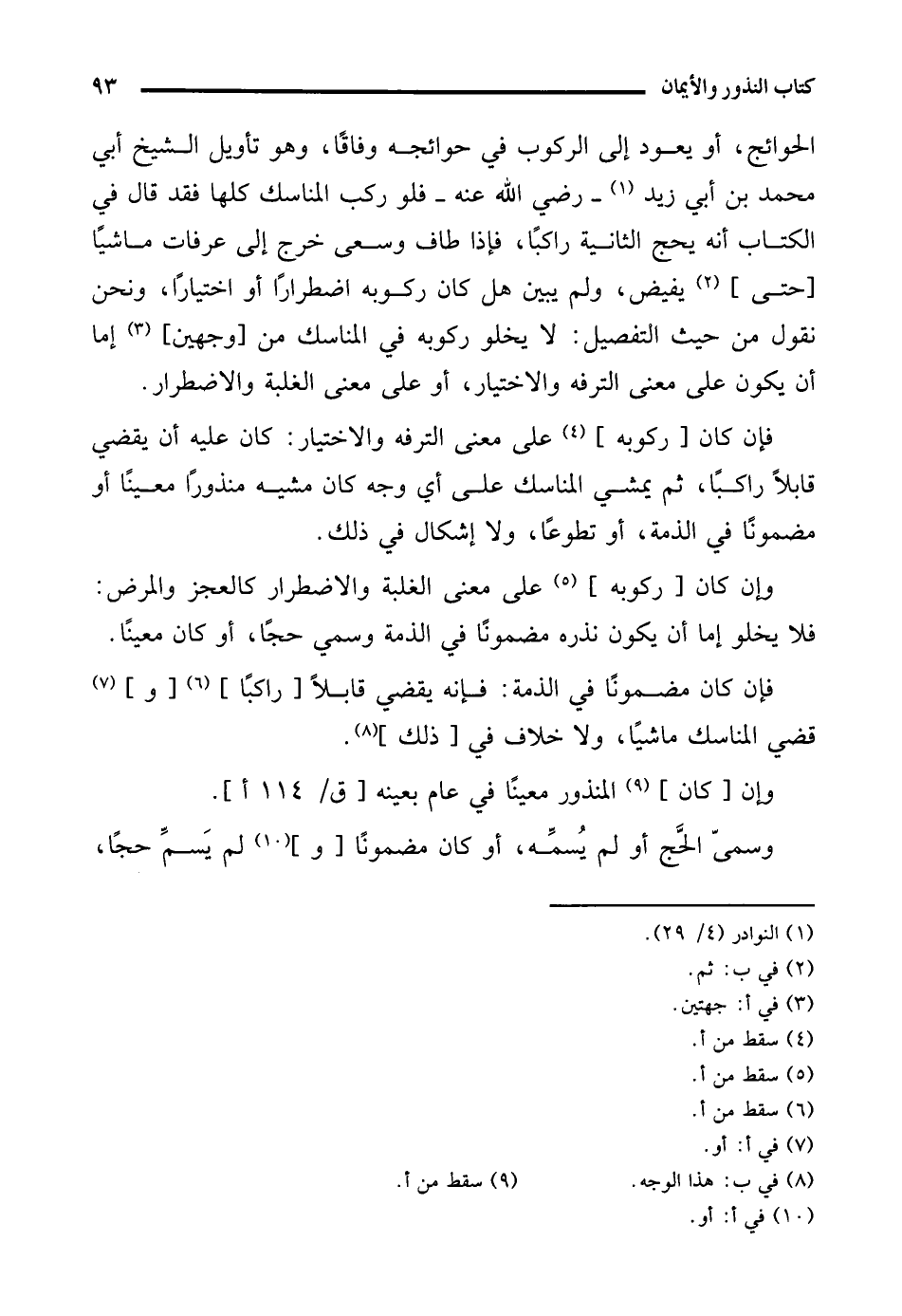 الحوائج، أو يعود إلى الركوب في حوائجه وفاقًا، وهو تأويل الشيخ أبي محمد بن أبي زيد (¬1) - رضي الله عنه - فلو ركب المناسك كلها فقد قال في الكتاب أنه يحج الثانية راكبًا، فإذا طاف وسعى خرج إلى عرفات ماشيًا [حتى] (¬2) يفيض، ولم يبين هل كان ركوبه اضطرارًا أو اختيارًا، ونحن نقول من حيث التفصيل: لا يخلو ركوبه في المناسك من [وجهين] (¬3) إما أن يكون على معنى الترفه والاختيار، أو على معنى الغلبة والاضطرار.