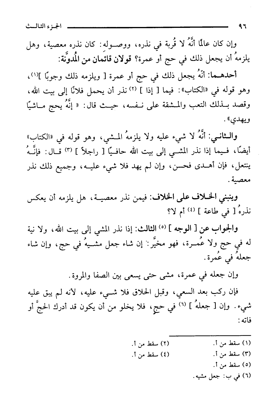 والجواب عن [الوجه] (¬5) الثالث: إذا نذر المشي إلى بيت الله، ولا نية له في حج ولا عُمرة، فهو مخيَّر: إن شاء جعل مشيهُ في حج، وإن شاء جعلهُ في عُمرة.