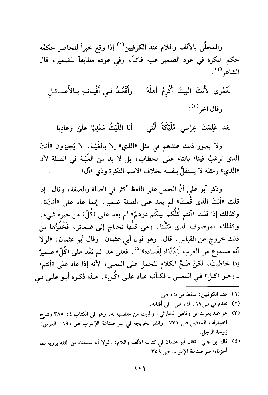 والمحلى بالألف واللام عند الكوفيين إذا وقع خبراً للحاضر حكمه حكم النكرة في عود الضمير عليه غائباً، وفي عوده مطابقاً للضمير، قال الشاعر: