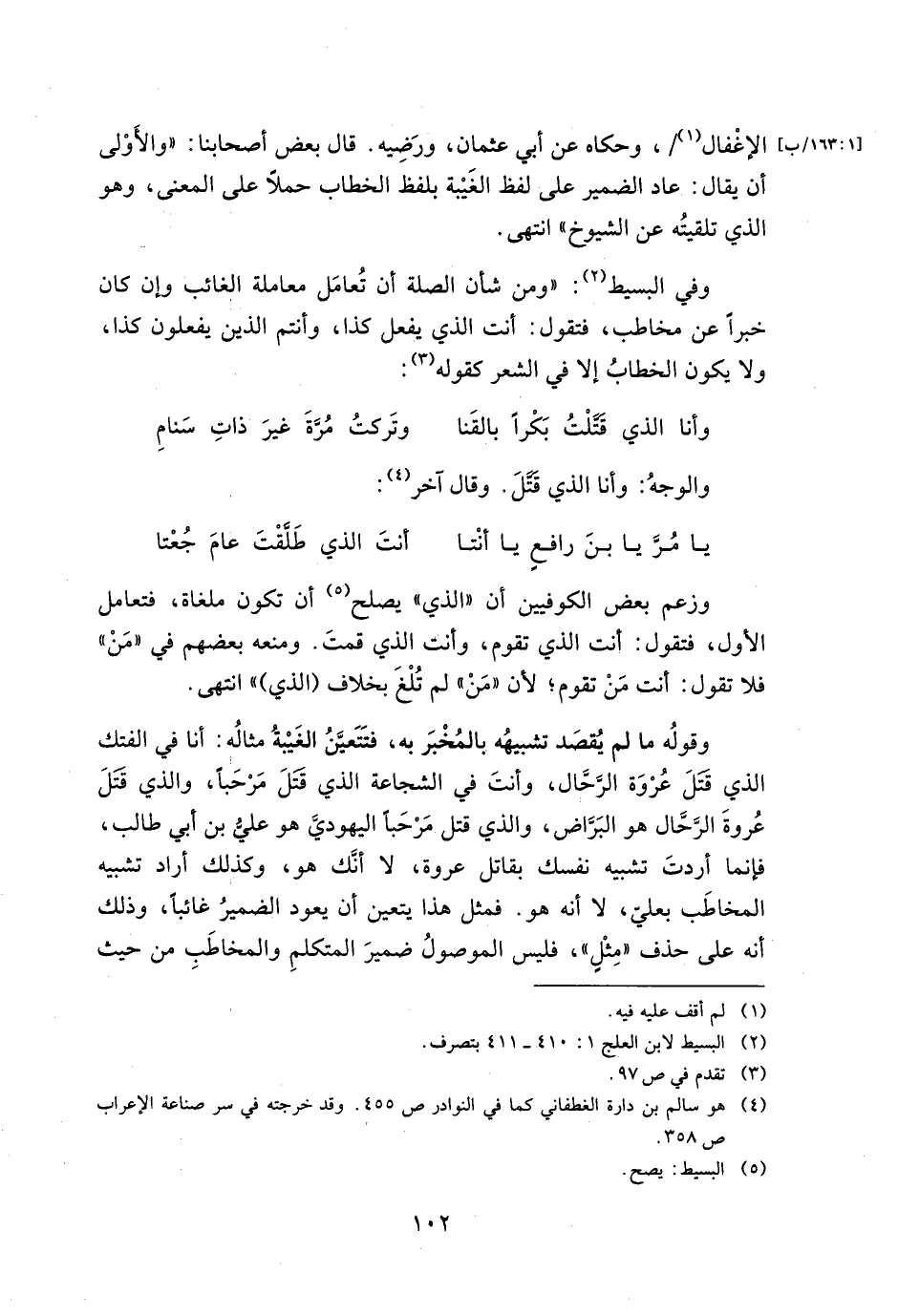 وفي البسيط: "ومن شأن الصلة أن تعامل معاملة الغائب وإن كان خبراً عن مخاطب، فتقول: أنت الذي يفعل كذا، وأنتم الذين يفعلون كذا، ولا يكون الخطاب إلا في الشعر كقوله: