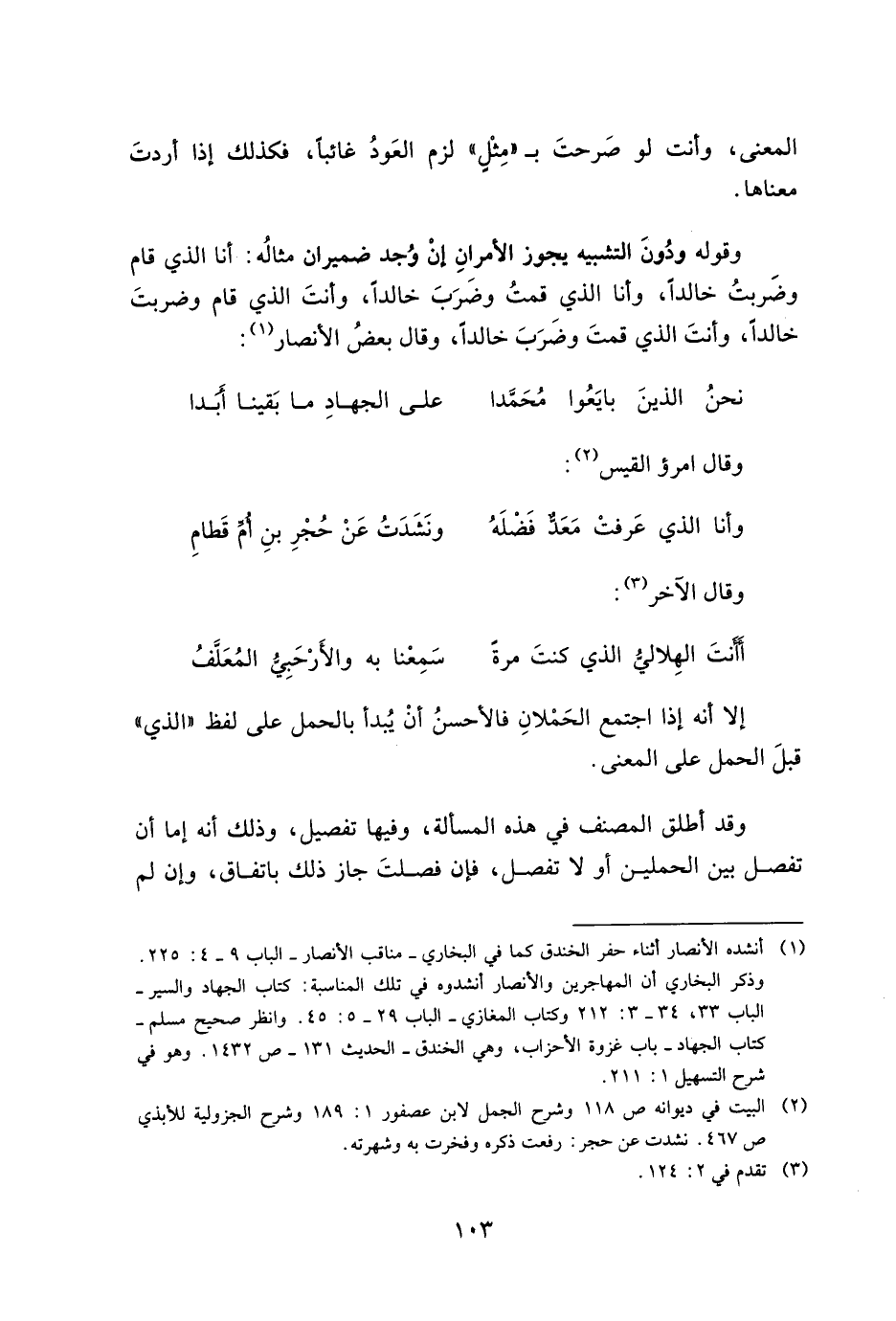 وقوله ودون التشبيه يجوز الأمران إن وجد ضميران مثاله: أنا الذي قام وضربت خالداً، وأنا الذي قمت وضرب خالداً، وأنت الذي قام وضربت خالداً، وأنت الذي قمت وضرب خالداً، وقال بعض الأنصار: