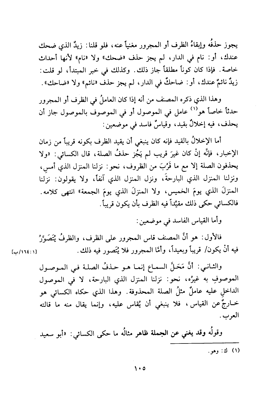 أما الإخلال بالقيد فإنه كان ينبغي أن يقيد الظرف بكونه قريباً من زمان الإخبار، فإنه إن كان غير قريب لم يجز حذف الصلة، قال الكسائي: "ولا يحذفون الصلة إلا مع ما قرب من الظروف، نحو: نزلنا المنزل الذي أمس، ونزلنا المنزل الذي البارحة، ونزل المنزل الذي آنفاً، ولا يقولون: نزلنا المنزل الذي يوم الخميس، ولا المنزل الذي يوم الجمعة" انتهى كلامه. فالكسائي حكي ذلك مقيداً فيه الظرف بأن يكون قريباً.