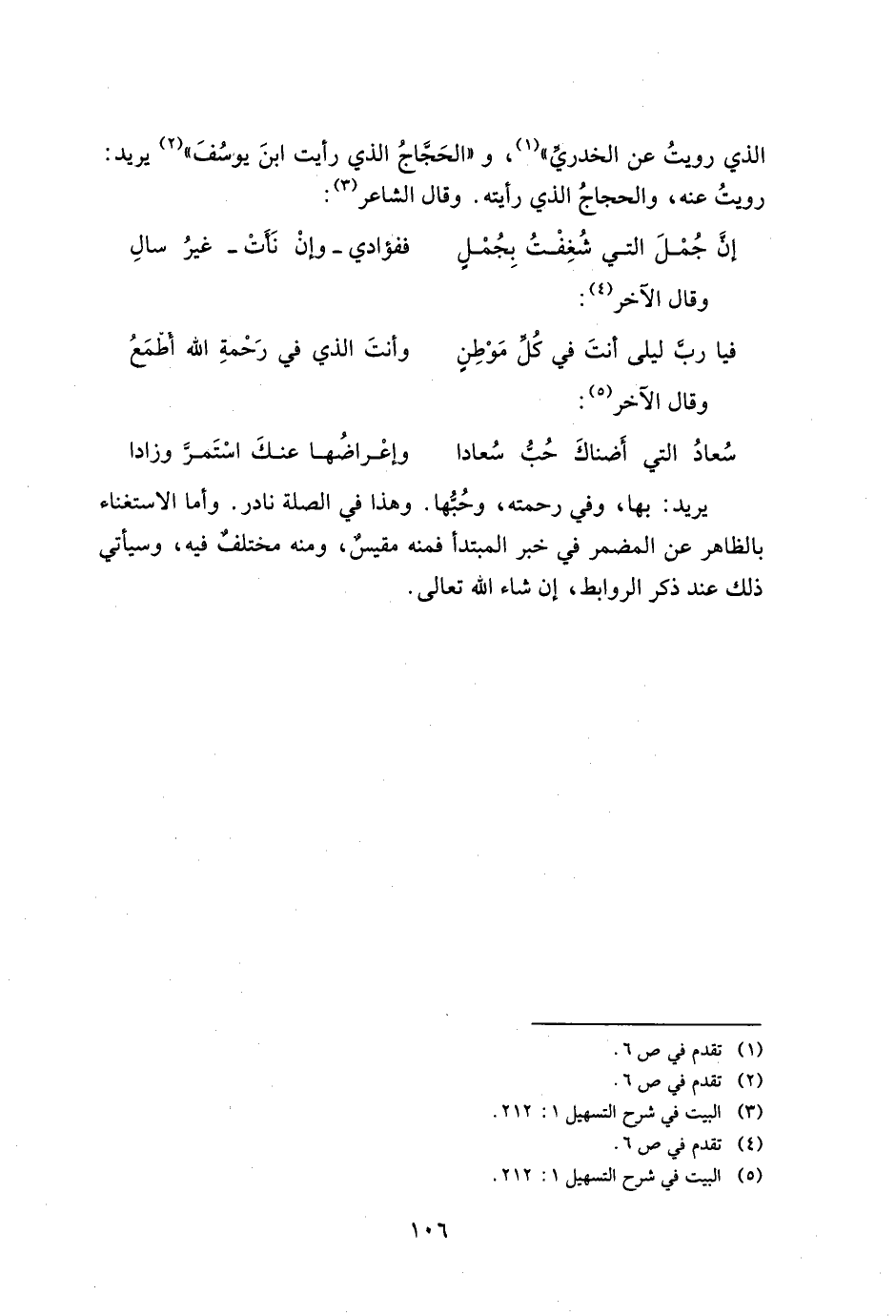 يريد: بها، وفي رحمته، وحبها. وهذا في الصلة نادر. وأما الاستغناء بالظاهر عن المضمر في خبر المبتدأ فمنه مقيس، ومنه مختلف فيه، وسيأتي ذلك عند ذكر الروابط، إن شاء الله تعالى.