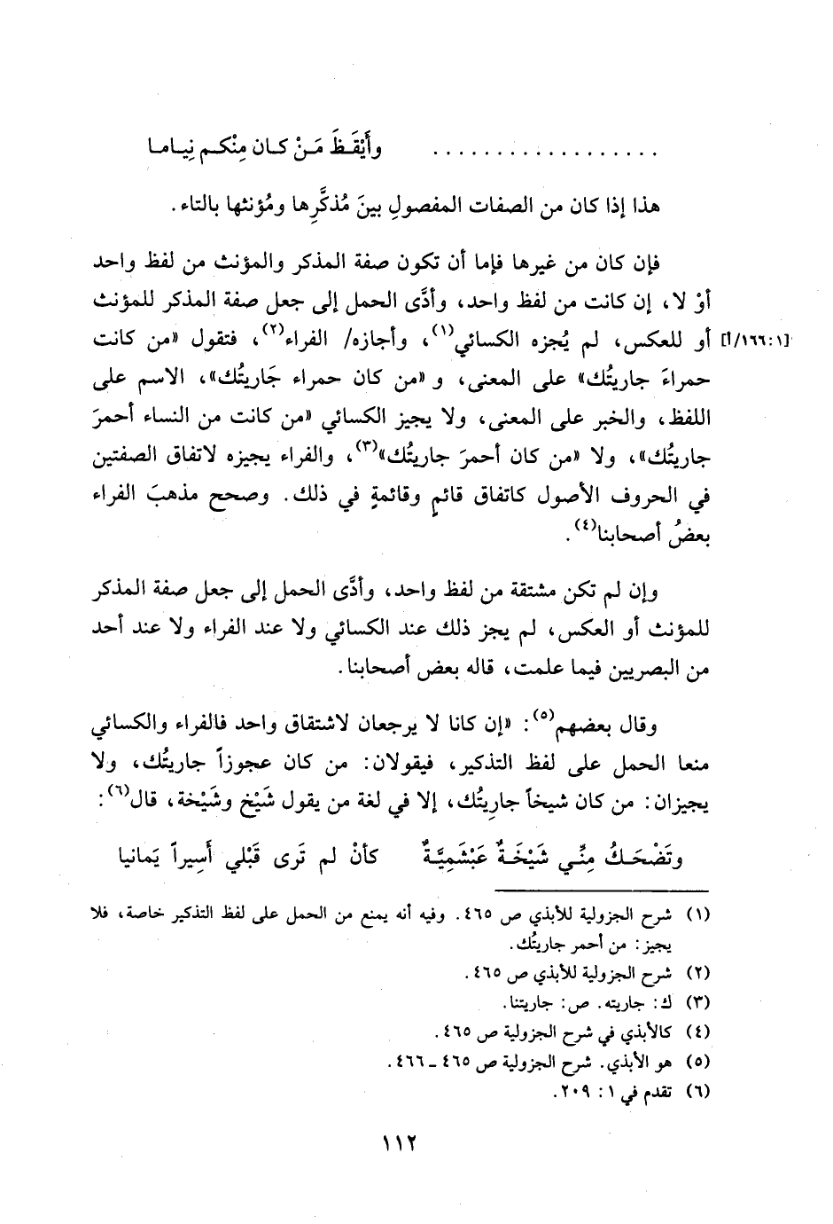 وإن لم تكن مشتقة من لفظ واحد، وأدى الحمل إلى جعل صفة المذكر للمؤنث أو العكس، لم يجز ذلك عند الكسائي ولا عند الفراء ولا عند أحد من البصريين فيما علمت، قاله بعض أصحابنا.