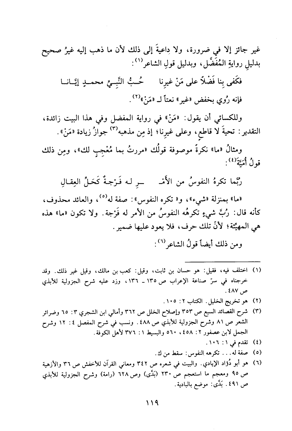 ومثال "ما" نكرة موصوفة قولك "مررت بما معجب لك"، ومن ذلك قول أمية: