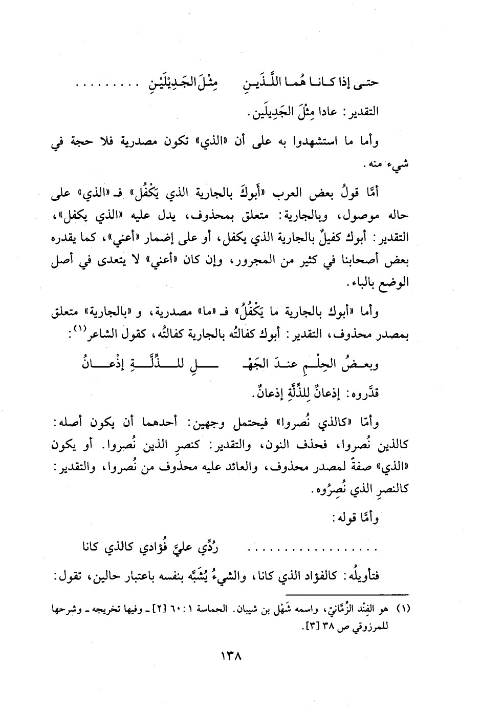 أما قول بعض العرب "أبوك بالجارية الذي يكفل" فـ"الذي" على حاله موصول، وبالجارية: متعلق بمحذوف، يدل عليه "الذي يكفل"، التقدير: أبوك كفيل بالجارية الذي يكفل، أو على إضمار "أعني"، كما يقدره بعض أصحابنا في كثير من المجرور، وإن كان "أعني" لا يتعدى في أصل الوضع بالباء.