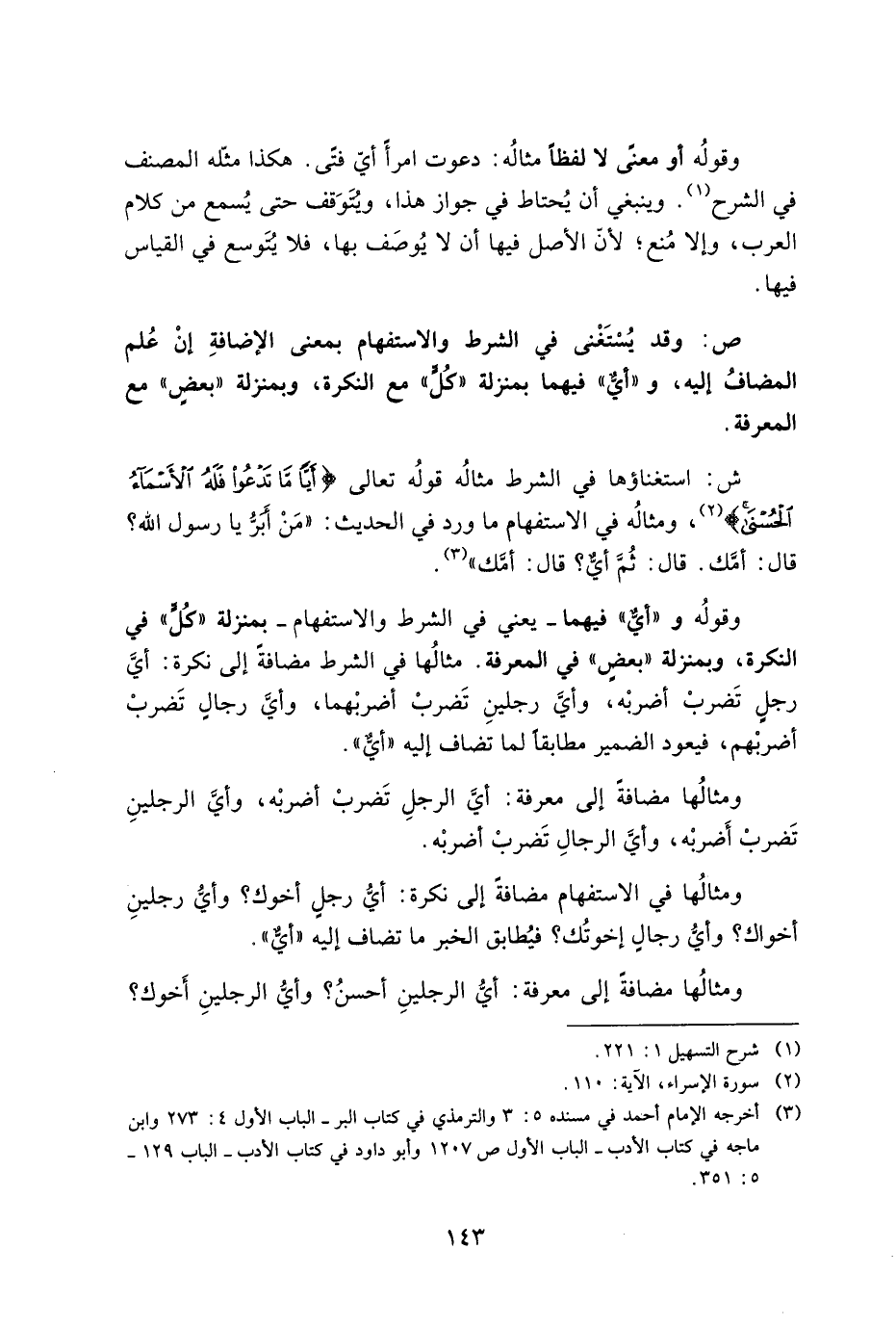 ش: استغناؤها في الشرط مثاله قوله تعالى {أَيّاً مَّا تَدْعُوا فَلَهُ الأَسْمَاءُ الْحُسْنَى}، ومثاله في الاستفهام ما ورد في الحديث: "من أبرُ يا رسول الله؟ قال: أمك. قال: ثم أيٌ؟ قال: أمك".